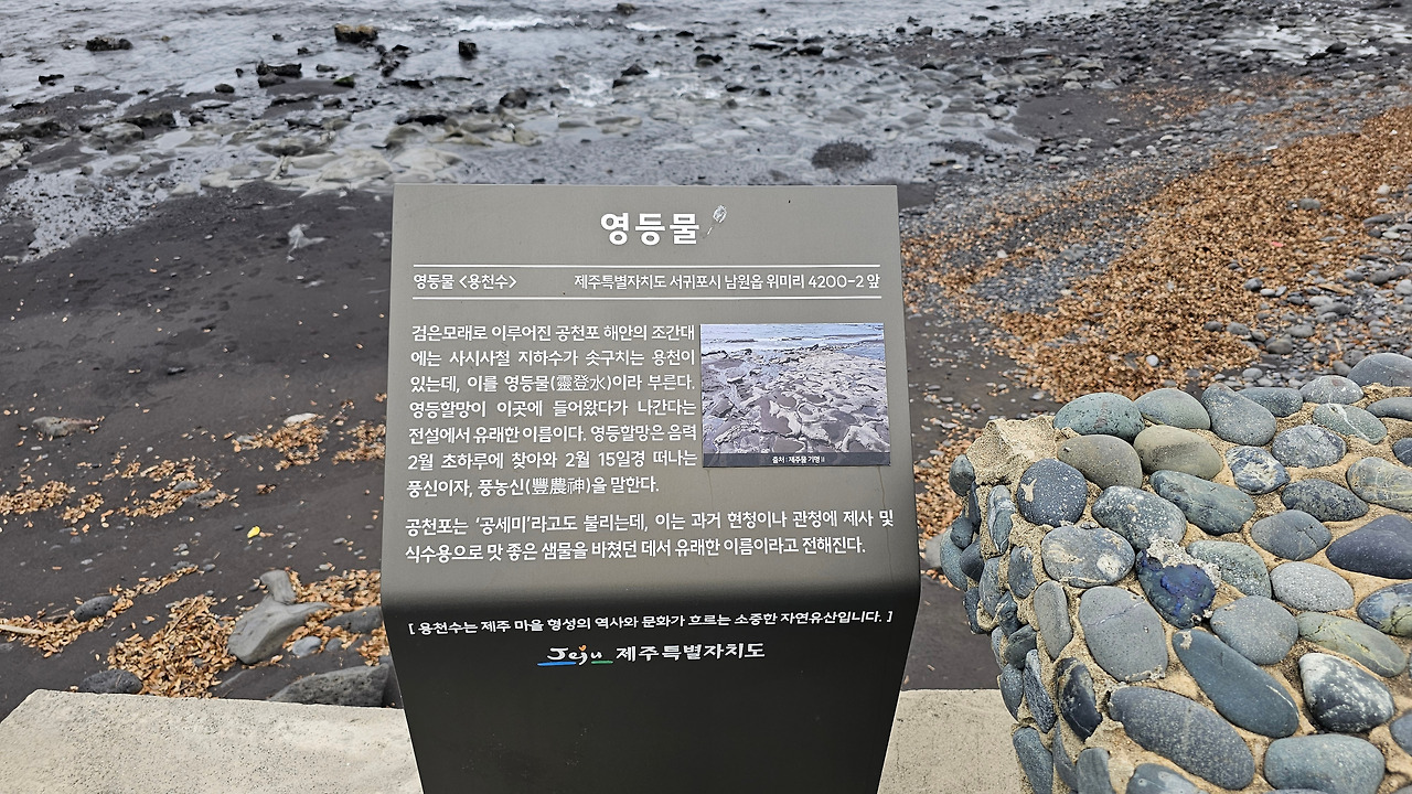 이어진 길은 시멘트 길이었고 공천 포구까지 이어졌다. 공천 포구의 해변은 검었다. 그리고 이곳에 사시사철 솟는 용천수가 있었고, 영등할망이 이곳에 들어왔다 나온다는 전설 때문에 이 용천수를 ‘영등물’이라고 불렀다. 또한 공천포는 공미세라고도하는데 과거 현청이나 관청에 제사 및 식용수로 맛 좋은 샘물을 바쳤던 데서 유래했다.