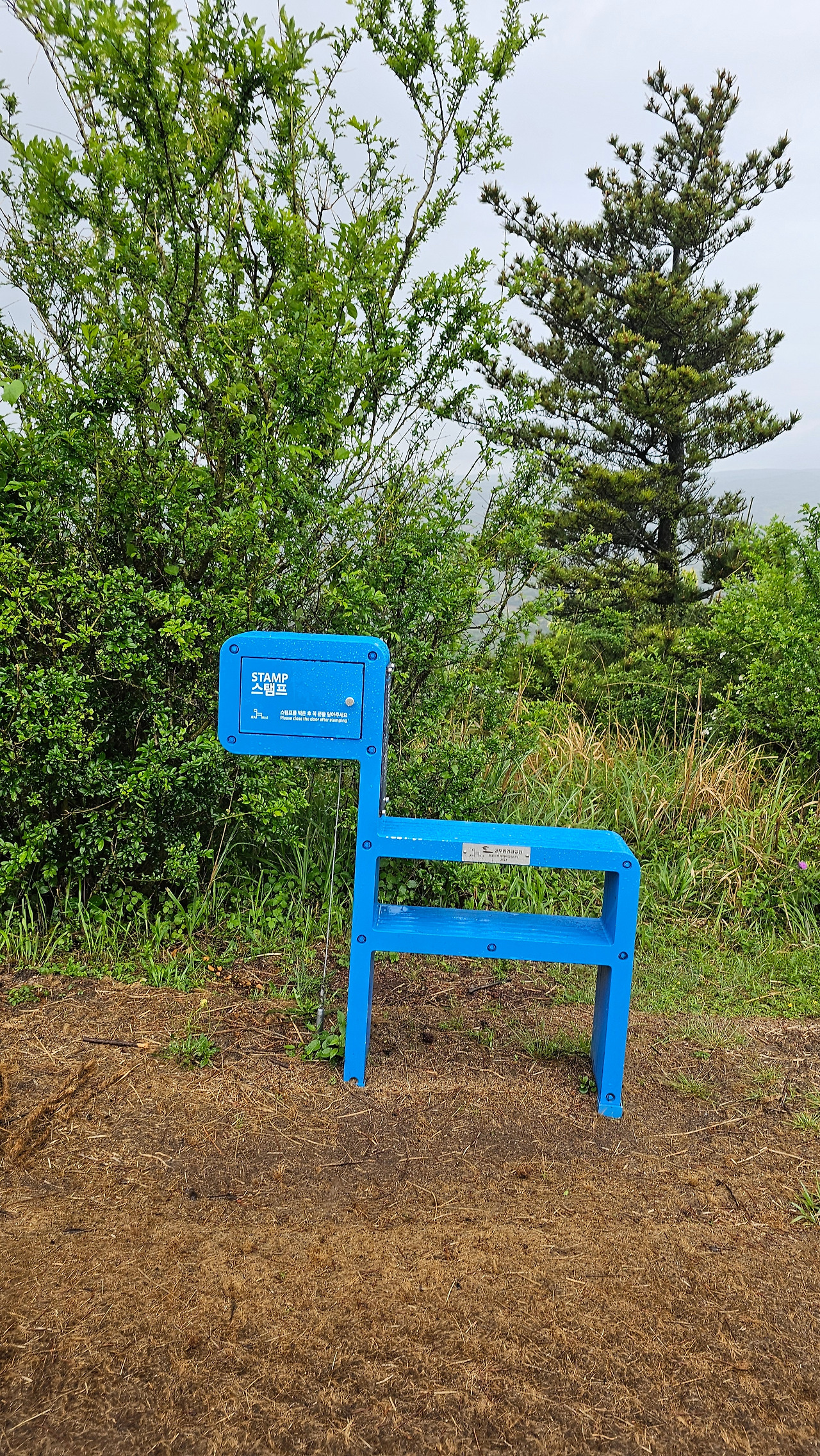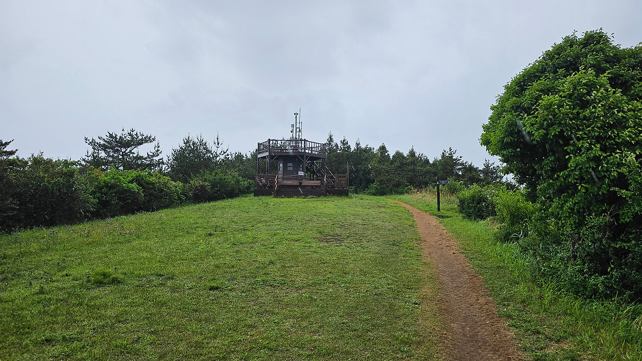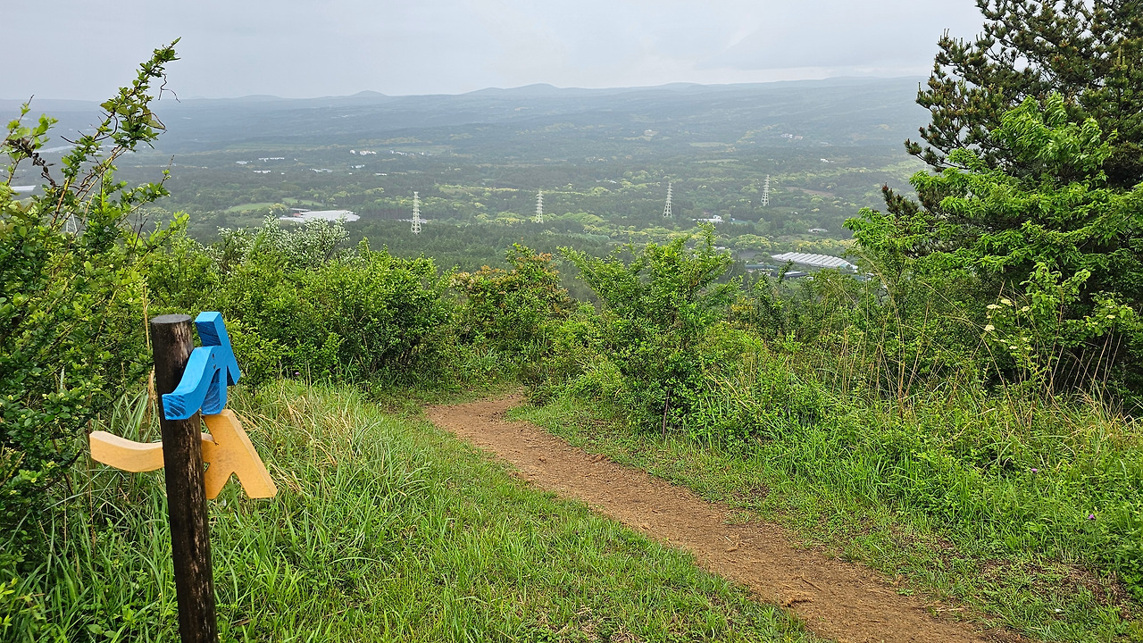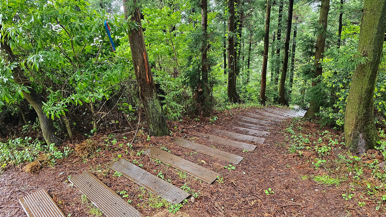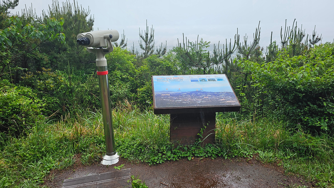 중간 스탬프를 찍고 다시 걸었다. 여전히 우산을 썼다. 비가 생각보다 많이 와서 그녀처럼 우비를 입을 생각하다 우비가 주는 땀복 같은 느낌 때문에 포기하고 우산으로 버티기로 했다. 길은 산 정상을 거의 한 바퀴 돌았다. 나무들로 닫힌 공간과 나무가 없는 열린 공간이 번갈아 나타났다. 또한 군데군데 전망대와 전망안내판이 있었다. 비가 오니 번거로워 망원경으로 풍경 보는 것을 포기하고 지나쳤다.
