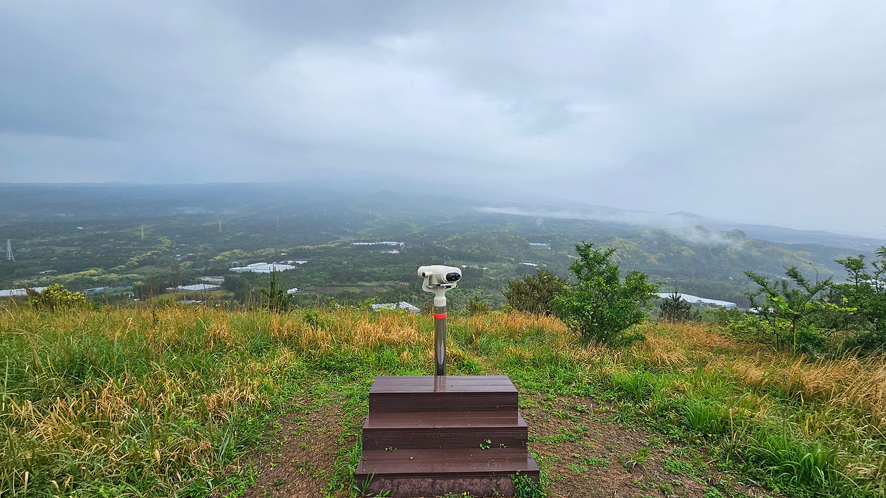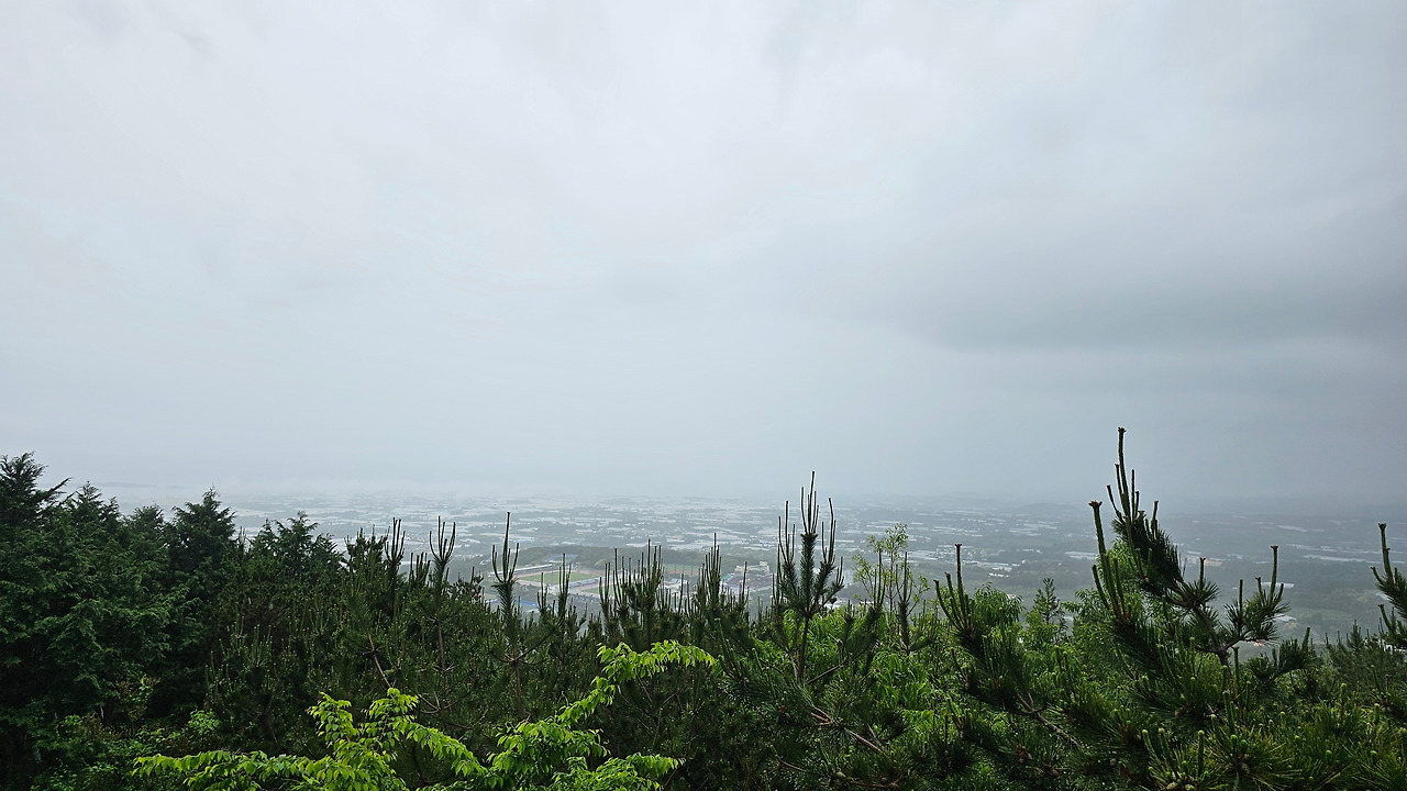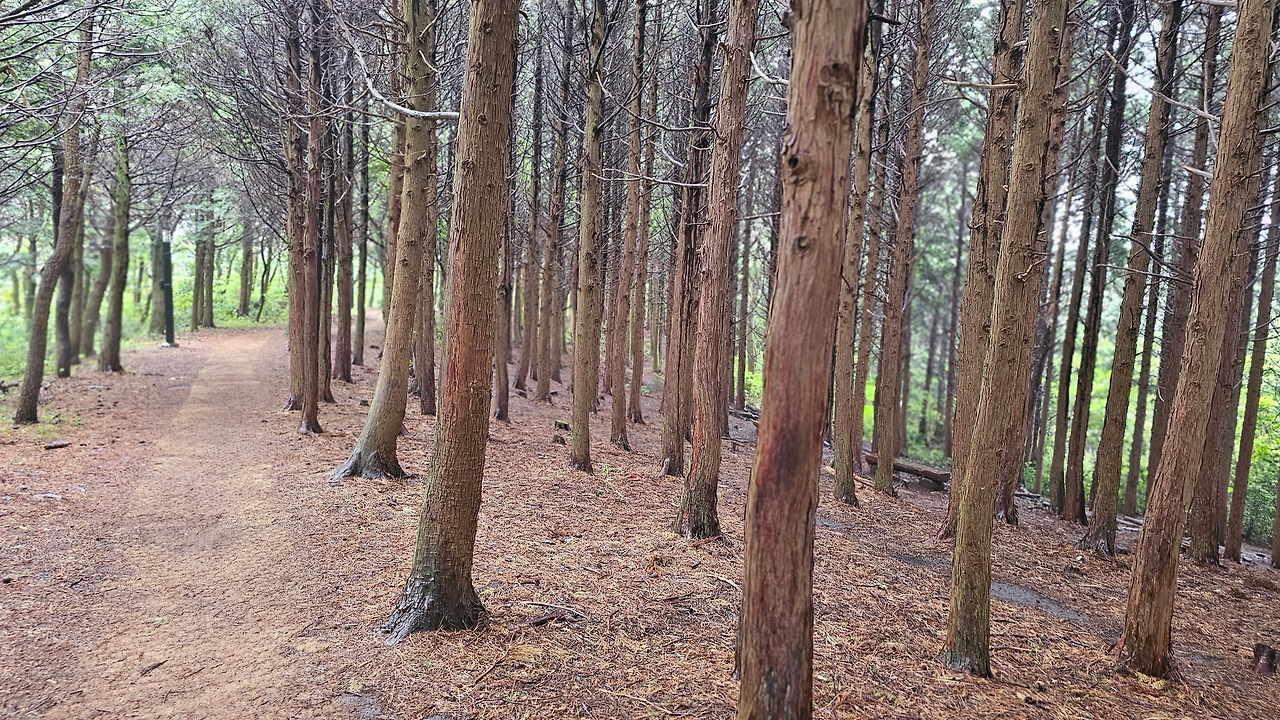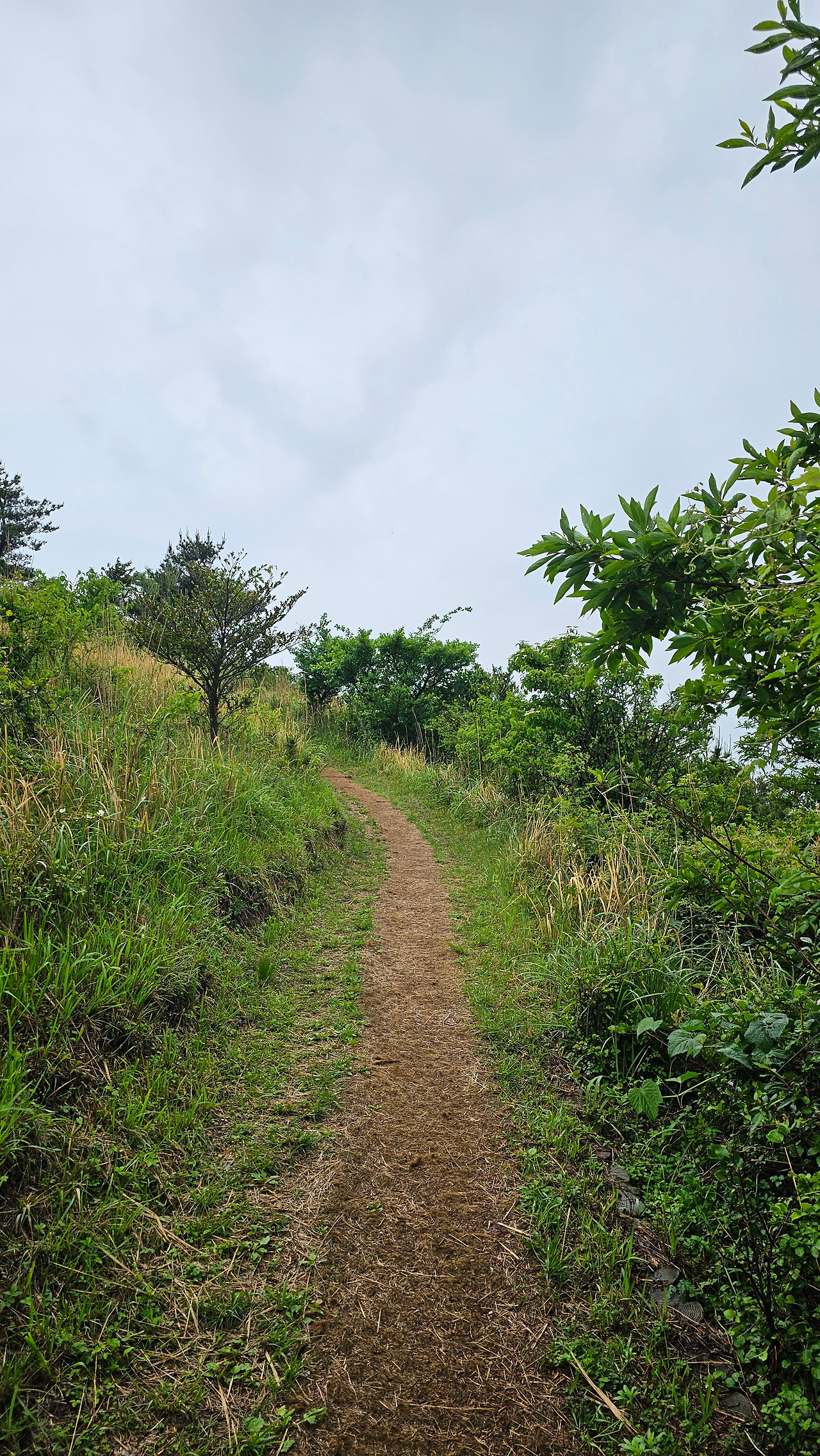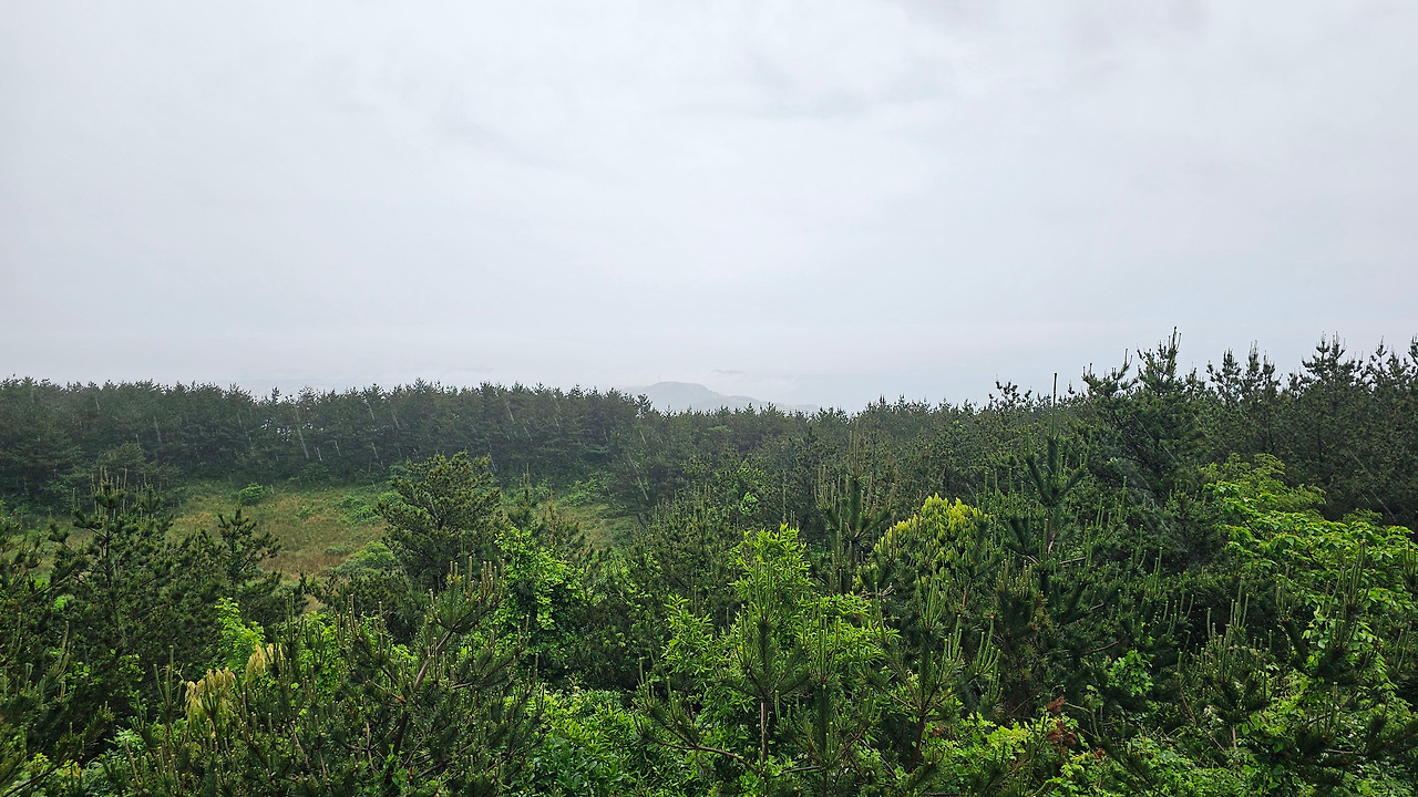 중간 스탬프를 찍고 다시 걸었다. 여전히 우산을 썼다. 비가 생각보다 많이 와서 그녀처럼 우비를 입을 생각하다 우비가 주는 땀복 같은 느낌 때문에 포기하고 우산으로 버티기로 했다. 길은 산 정상을 거의 한 바퀴 돌았다. 나무들로 닫힌 공간과 나무가 없는 열린 공간이 번갈아 나타났다. 또한 군데군데 전망대와 전망안내판이 있었다. 비가 오니 번거로워 망원경으로 풍경 보는 것을 포기하고 지나쳤다.