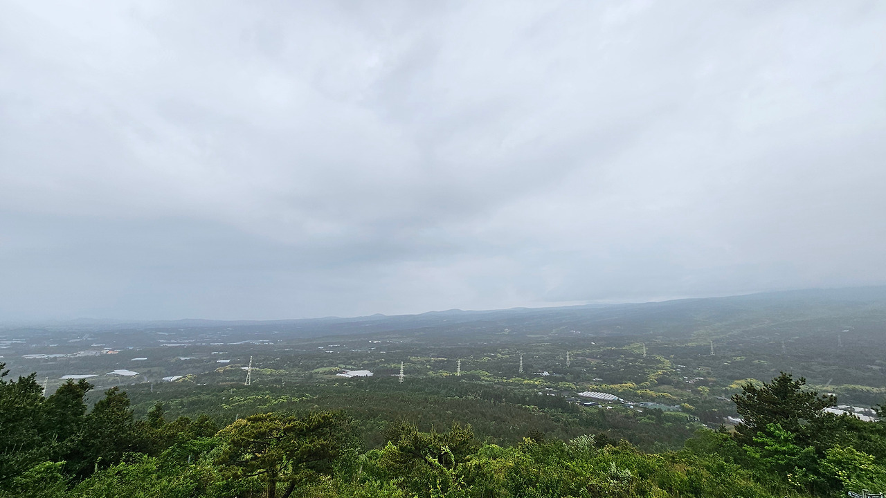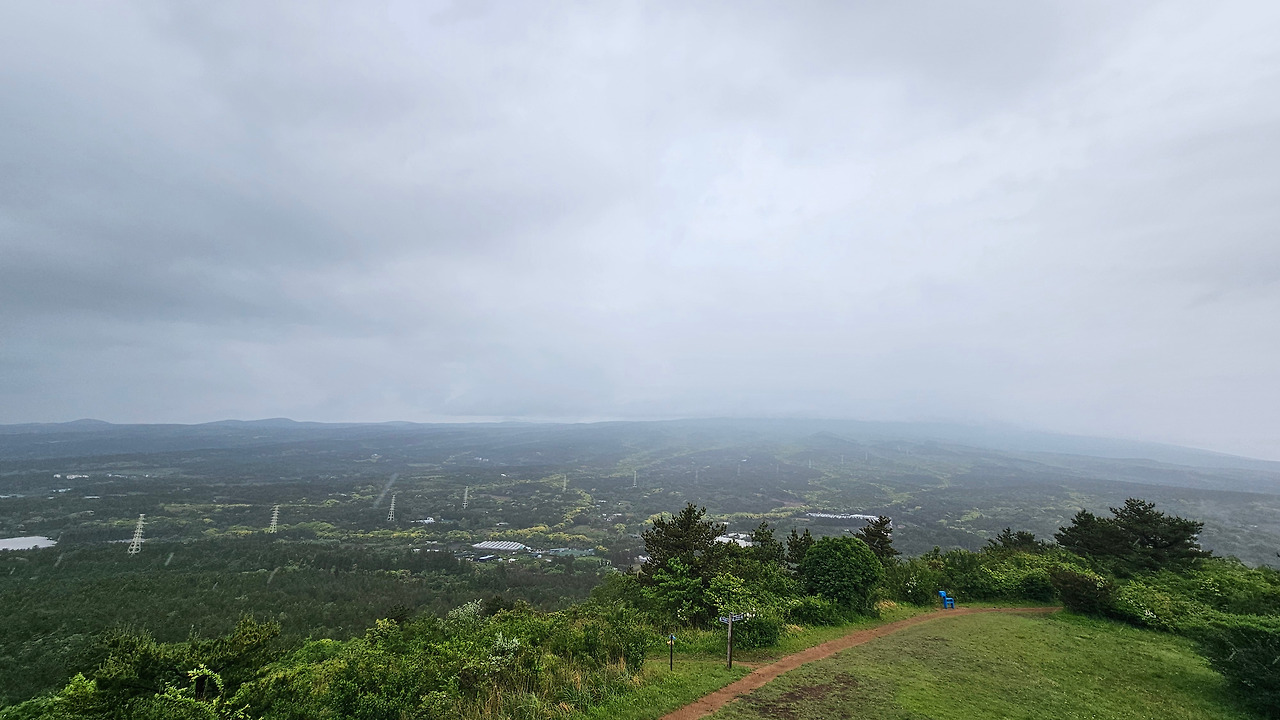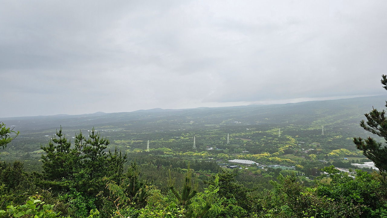 한라산 정상은 비구름으로 인해 보이지 않았다. 비구름은 오른쪽이 더 짙어 어두웠다. 농담으로 무정형의 움직임을 보여주었다. 비구름 밑으로 초록의 대양이었다. 산이라는 느낌보다는 끝없이 출렁이는 초록의 바다였다. 초록의 융단은 너무도 작은 비유였다. 한라산은 크기를 가늠할 수 없었다. 내 감각이 받아들일 수 있는 크기와 넓이를 넘어섰다. 한계를 넘어선 감각은 고장을 일으켰고, 그것은 전율로 나타났다. 크기로는 무엇에도 밀리지 않는, 성큼성큼 걸었을 송전탑들이 작은 장난감 송전탑처럼 보였다. 일정한 간격을 유지하며 벌어진 곳을 집은 스테이플러 철심 같기도 했다. 카메라 기능 중 풍경의 사물을 작은 장난감처럼 보여주는 미니어처 기능을 사용한 풍경 같았다. 비가 쏟아져 시야를 방해하고 있어도, 한라산은 아랑곳하지 않고 자신의 위용을 또렷이 보여주었다. 넋을 잃고 봤다. 대양은 용암으로 변했다. 밝은 초록이 짙은 초록 사이로 흘러가고 있다고 느꼈다. 그건 물줄기가 아니라 용암이었다. 초록의 용암. 한라산이 바닷가까지 내보낸 붉은 용암은 식으며 제주도의 지반이 되었고, 그 위로 초록의 용암이 한라산에서 매년 저렇게 흐르고 있었다.