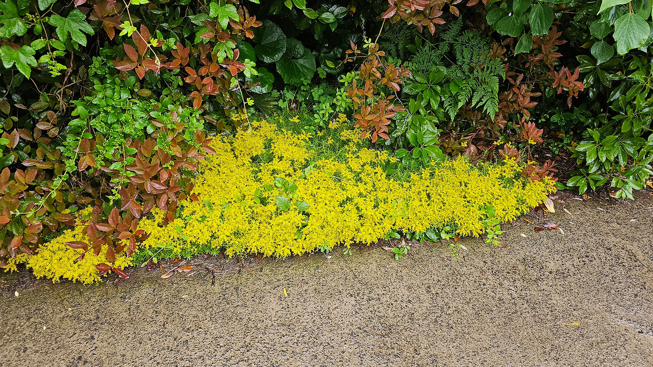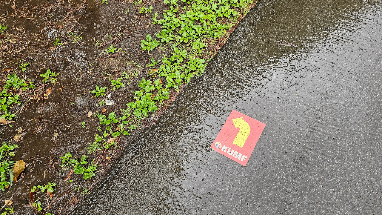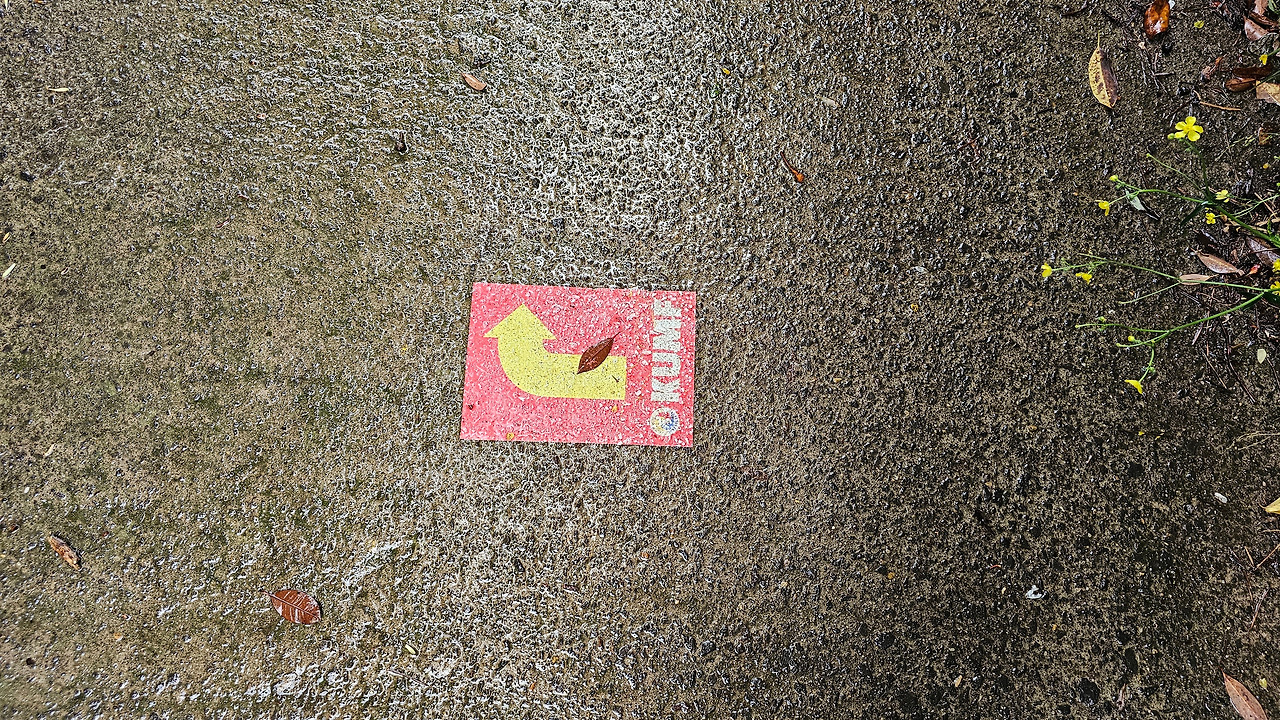 도로를 조금 걸으니 다시 숲길을 가리키는 화살표가 보였다. 그 화살표 전에, 도로에 KUMF라고 쓰인 작은 사각형 안내표지가 보였다. 그 안의 화살표도 올레길을 가리켰다. 올레와 관련된 것으로 생각하며 숲으로 들어갔다. 길은 비로 인해 엉망이었다. 고근산에서 내려오면서 신발은 다 젖었다. 신발마저 젖어버리니 안 젖으려는 노력은 쉽게 포기가 되었다. 오히려 편했다. 그래도 물웅덩이는 피하며 걸었다.