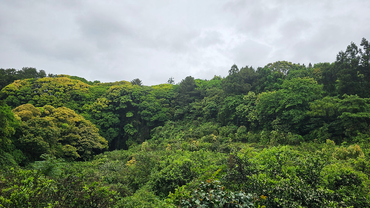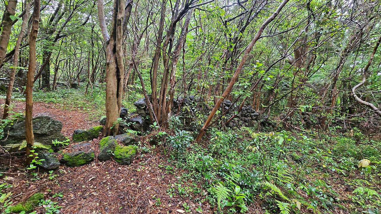 도로에서 게스트하우스를 지나니 바로 도로를 사이에 두고 젖고 있는 숲길이 이어졌다. 화살표가 보였다. 멧돼지 출현을 알리는 경고판을 뒤로 하고 도로에서 벗어나 또 숲길로 갔다. 하늘이 열린 초록의 길이었다. 열려도 하늘은 어두웠고 비로 인해 고개조차 들 수 없었다. 이내 길은 하늘을 가리고 있는 앙상한 나무들 사이로 희미하고 거칠게 나 있었다. 나무 숲길에서 어느 순간부터 낮은 긴 돌담들이 보였다. 그 돌담의 용도를 모르겠다. 확실한 건 지금은 쓸모가 없는 것처럼 버려진 느낌이었다. 경계를 나타낸 돌담일까? 숲길은 세 번째 만난 시멘트 도로에서 끝났다. 여전히 비는 오고 있었다. 지나온 길이 숨어있는 숲을 보았다. 비를 맞아 초록은 더 짙어 무거워 보였다. 그리고 어떤 생명이 느껴졌다. 그 생명은 잔뜩 웅크리고 있었고 그로 인해 어두워 보였다. 거기에 외피의 무거움까지 더해져 그것은 웃음기 없이 진지했다. 나는 저 한없이 진지한 숲이 낸 길을 지나왔다. 돌담이 있고, 풀이 자라고, 나무가 솟아 하늘을 가리고 있었지만, 그럼에도 공간은 곳곳이 비어있었다. 그래서 숲의 속은 공허했다. 공허하기에 저렇게 진지한 걸까? 비에 젖고 있는 숲을 보니 이현승 시인의 ‘비의 무게’라는 시가 떠 올랐다.