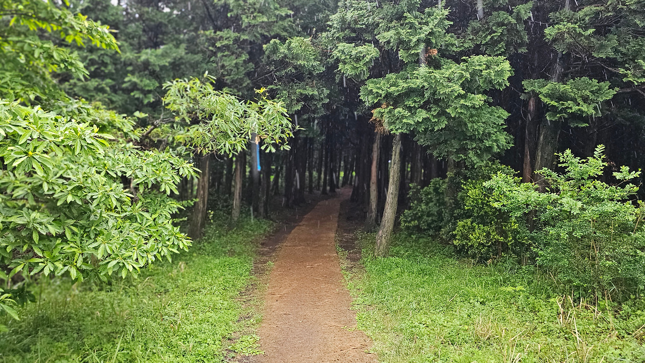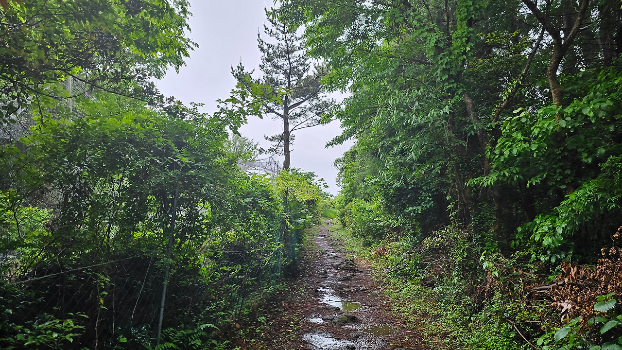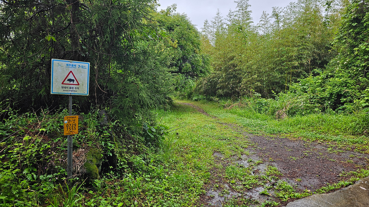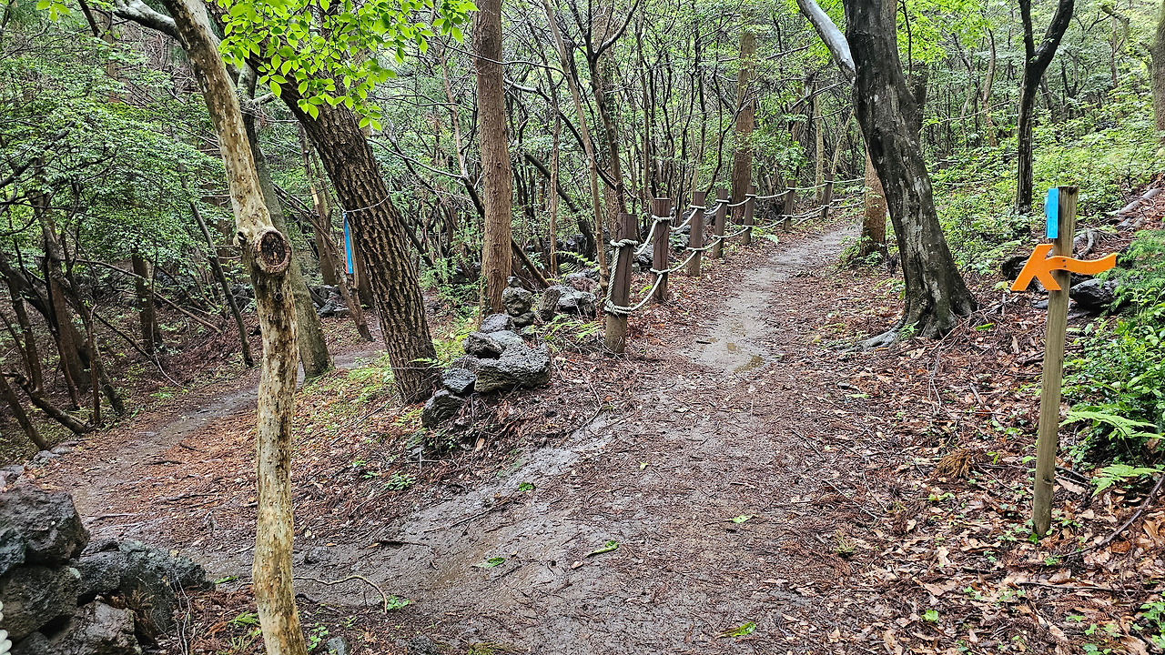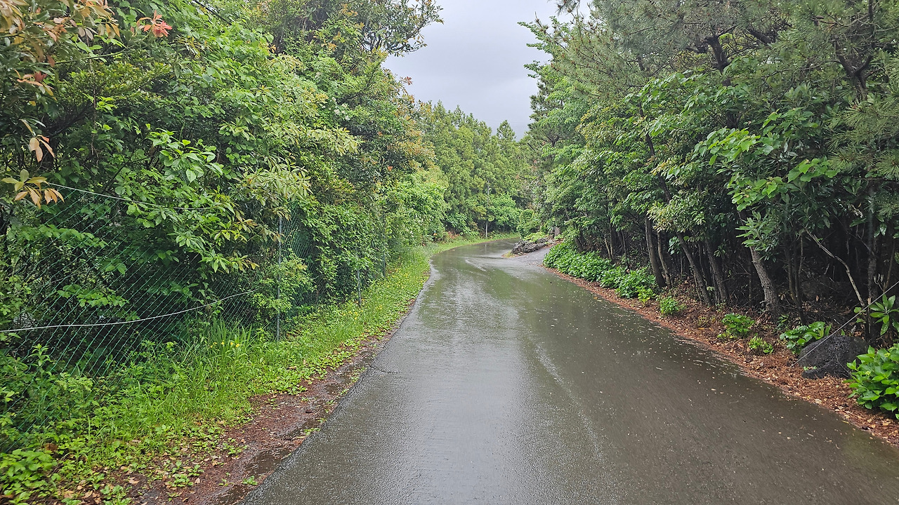 내려가는 길은 초반에 나무계단이었으나 이후부턴 흙길이었다. 우산을 쓰고 스틱을 짚고 내려가는 것이 너무 불편했다. 그래서 우산을 접고 비를 맞으며 걷기로 했다. 엉또폭포로 내려가는 산길은 세 개의 도로와 만나 잘린다. 첫 번째 도로와 만나기 전, 가파른 숲길에서 검은 우의를 입고 올라가는 남자와 스쳤다. 그러면서 ‘수고하세요’라고 서로 말하며 서로 응원했다. 이런 날에 올레 산길을 걷는 미친 서로를 위한 응원이었다.