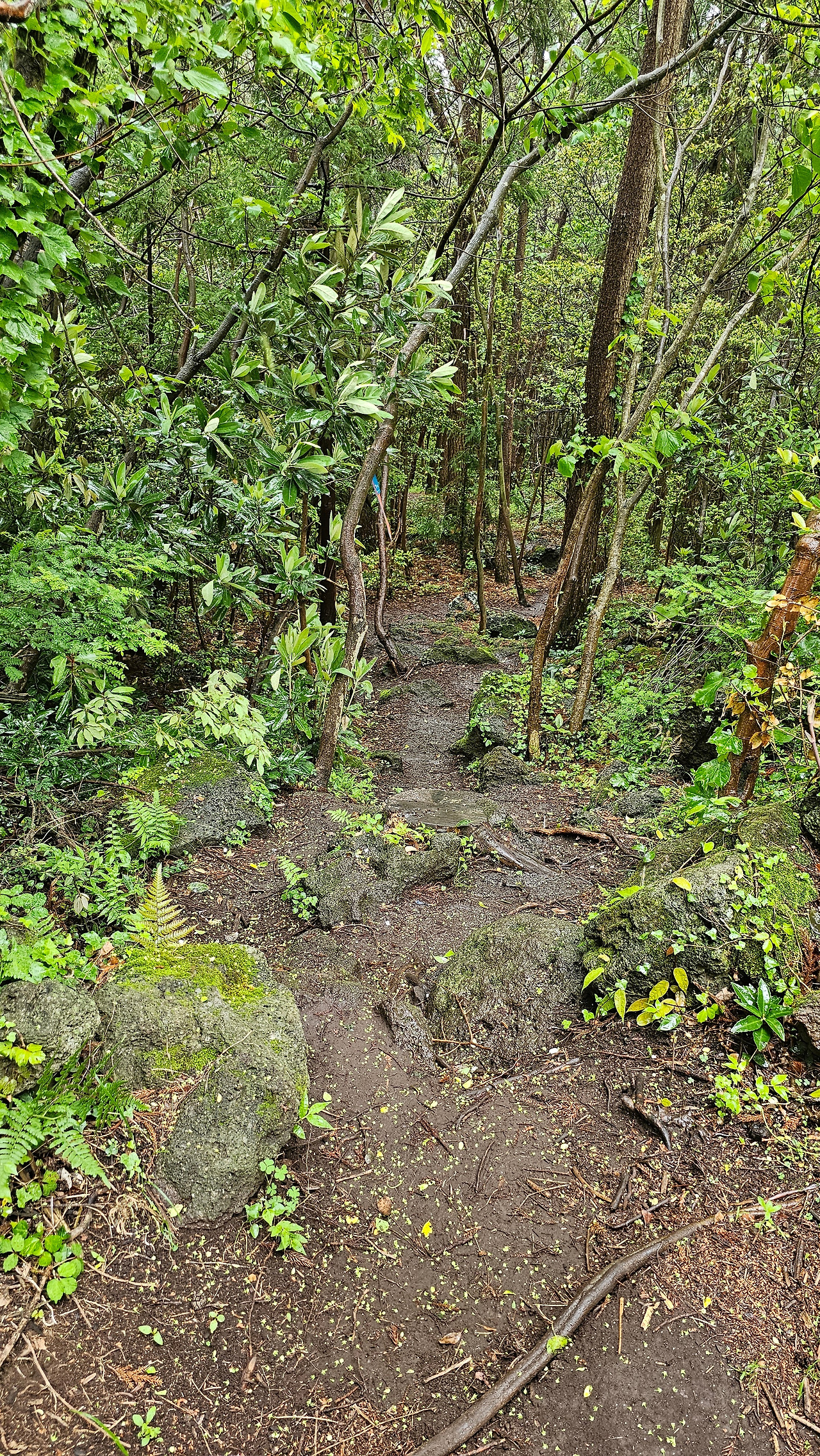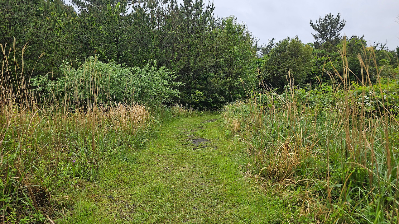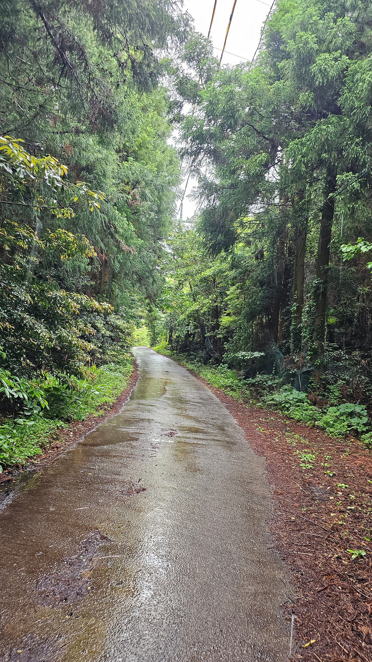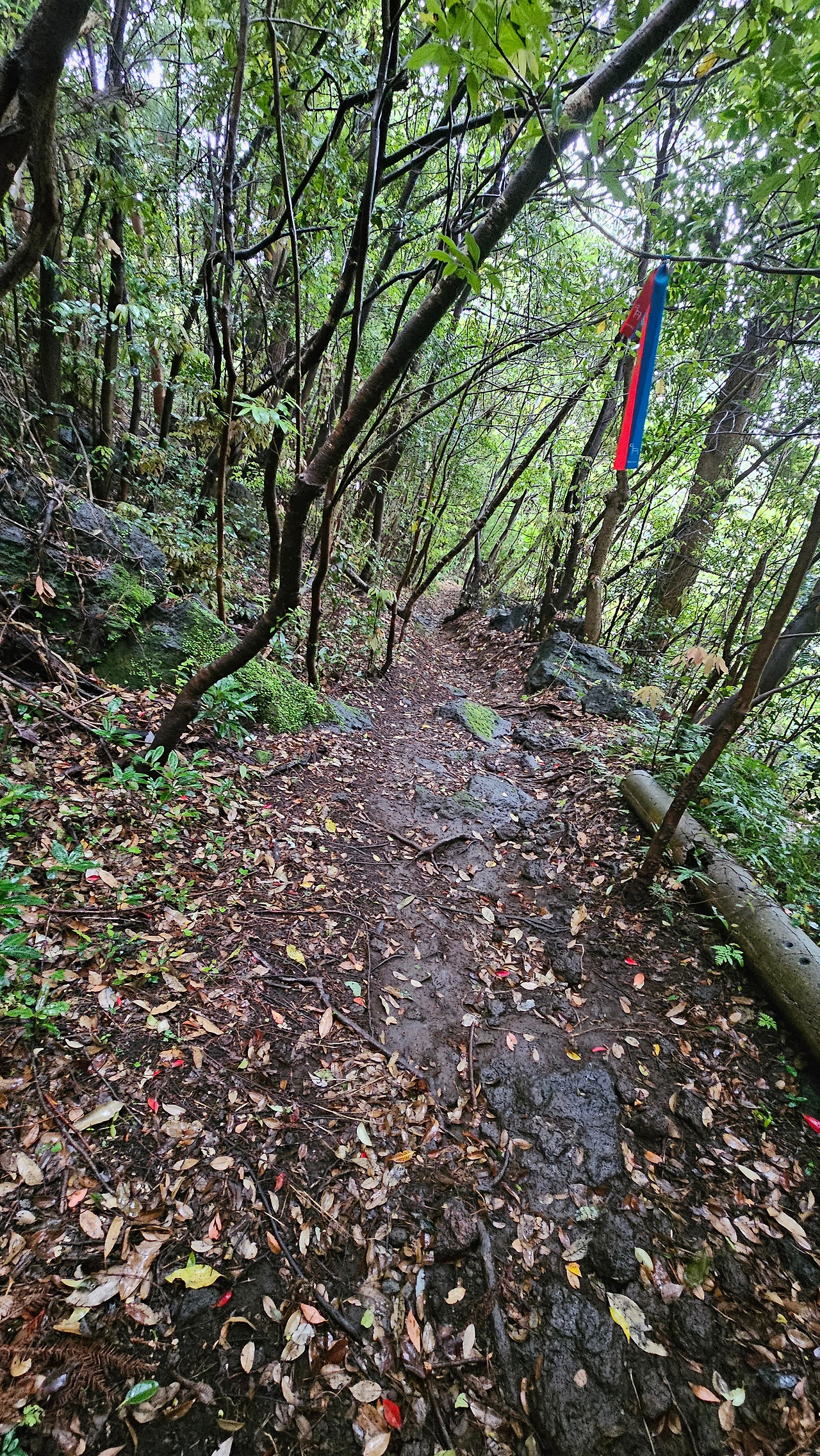 내려가는 길은 초반에 나무계단이었으나 이후부턴 흙길이었다. 우산을 쓰고 스틱을 짚고 내려가는 것이 너무 불편했다. 그래서 우산을 접고 비를 맞으며 걷기로 했다. 엉또폭포로 내려가는 산길은 세 개의 도로와 만나 잘린다. 첫 번째 도로와 만나기 전, 가파른 숲길에서 검은 우의를 입고 올라가는 남자와 스쳤다. 그러면서 ‘수고하세요’라고 서로 말하며 서로 응원했다. 이런 날에 올레 산길을 걷는 미친 서로를 위한 응원이었다.
