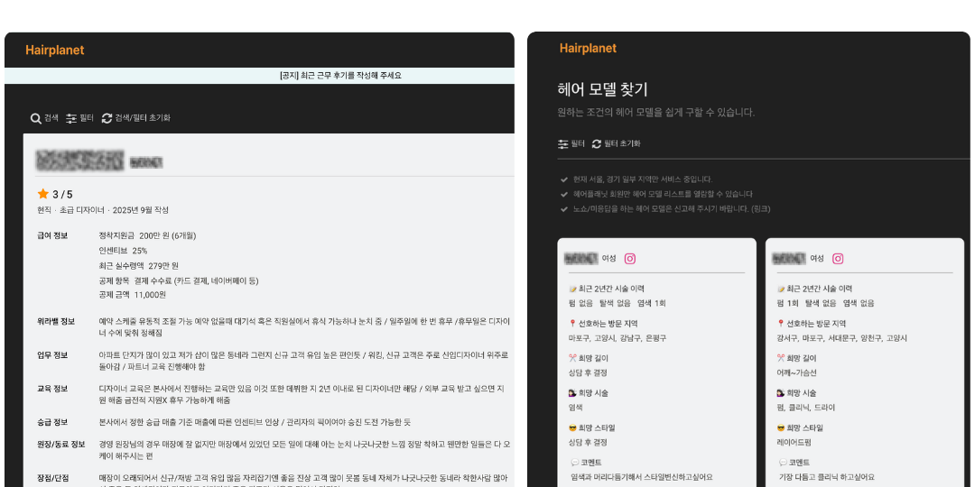 (좌) 미용실 근무 후기 공유 서비스 (우) 헤어 모델 서비스
