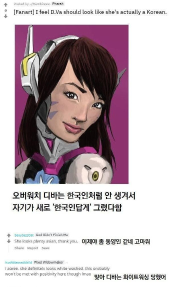 그러나 일부? 서양인들은 그런 얼굴은 전혀 '동양적'이지 않다고 생각하는 것 같습니다. 다음은 어떤 서양인이 새로 그린 오버워치 디바의 얼굴입니다. 댓글을 보면 그들은 동양 여자는 이렇게 생겨야 한다고 믿는다는 것을 알 수 있는데요.