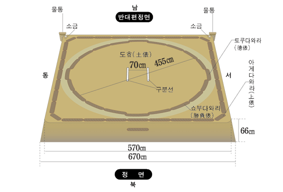 이를 위해서인지 스모는 경기장 규격도 작고 모래도 얕게 깔려 있는 것을 볼 수 있는데요. 경기장 밖으로 밀려나기 좋게 마찰을 줄인 듯합니다. 실제 스모 경기를 보면 밀리는 리키시(선수)의 발이 모래에 깊이 들어가지 않고 주르륵 밀리는 것을 볼 수 있습니다.