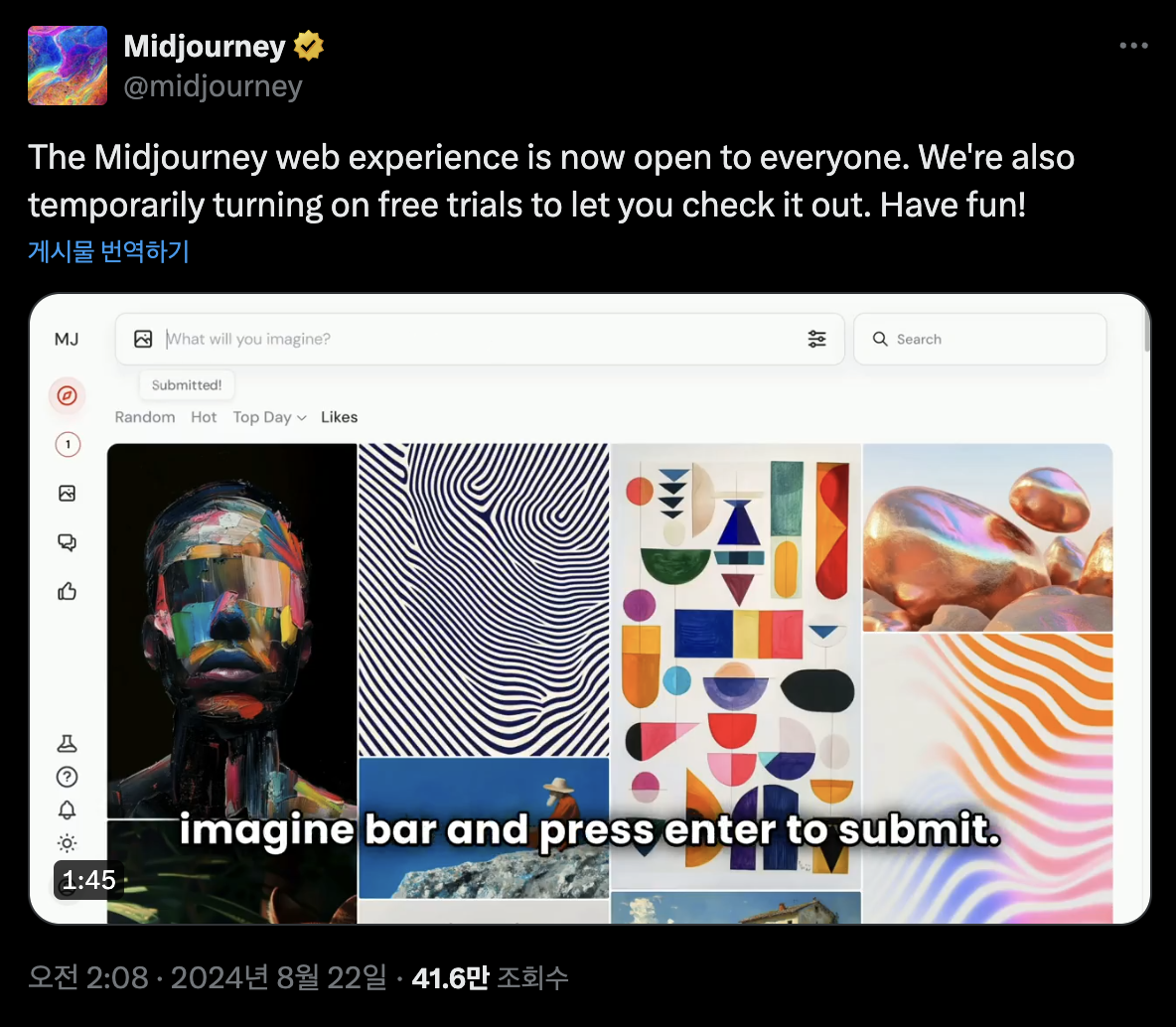 이제 누구나 Midjourney 웹 환경을 이용할 수 있습니다. 또한 한시적으로 무료 평가판을 통해 직접 확인해 보 수 있다고 합니다. 이전에는 미드저니를 활용하기 위해서는 디스코드 앱을 통해 진행했어야 했는데 "Web quick start" 웹으로도 이미지를 생성할 수 있도록 서비스가 업데이트되었습니다.
