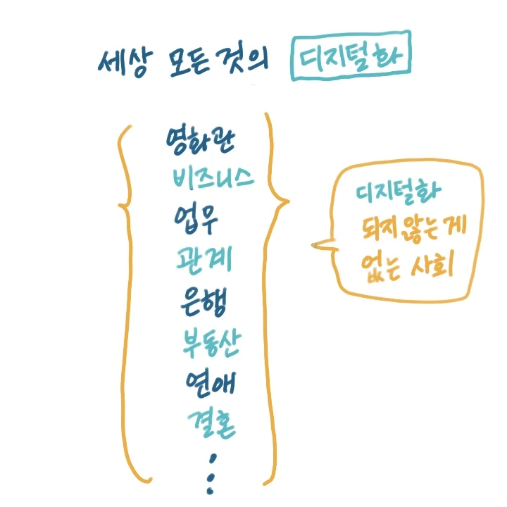 세상의 모든 것이 디지털화되고 있어요. 학교와 회사에서 시작된 디지털화는 일상생활에도 파고들고 있습니다. 사람과의 관계, 영화 보는 일, 은행, 부동산. 심지어 연애, 결혼까지도 디지털화가 진행되고 있어요.