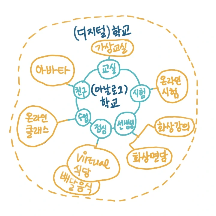 아날로그 학교에서 실제의 나는, 친구와 선생님을 만나고 수업도 하고, 시험도 치르죠. 이런 활동들은 디지털 학교에서 조금은 비슷하게, 때로는 완전히 다르게 구현되어 진행돼요.