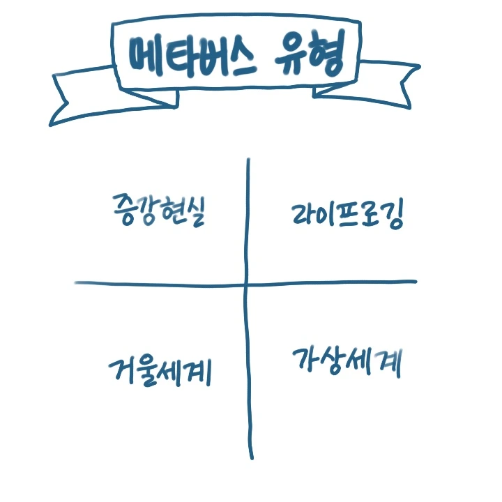 증강현실(Augmented Reality) 세계, 거울 세계(Mirror Worlds), 라이프로깅(Lifelogging) 세계, 가상 세계(Virtual Worlds). 4가지 유형 소개 및 관련된 대표적인 사례들은 다음 글에서 소개할게요.