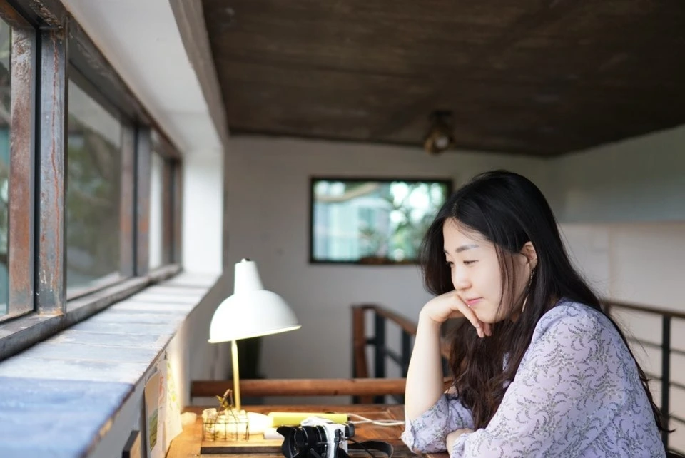 우리는 시럽 뺀 당근 주스를 주문하고 2층으로 올라갔다. 가파른 계단을 조심조심 딛고 올라서자 가로로 길게 난 창이 예쁜, 작은 공간이 나왔다. 촉촉하게 젖은 제주의 뒷마당이 창문 가득 담겨 있어 신이 났다.