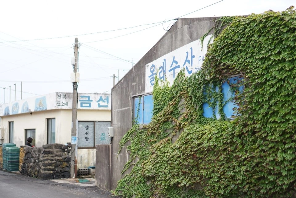 다들 일손이 바빠 나가셨는지 골목에는 인적이 없이 조용했다. 자칫 폐가 될까 싶어 조근조근 떠드는 우리의 말소리가 짙은 돌담을 타고 넘어갔다. 집집마다 고운 바다색을 닮은 지붕을 쓰고 있어 참 제주다웠다. 회색빛 시멘트가 그대로 보이는 작은 공장은 덩굴로 화사하게 옷을 입고 있어 되려 싱그러웠다.