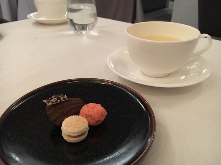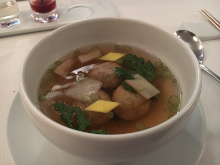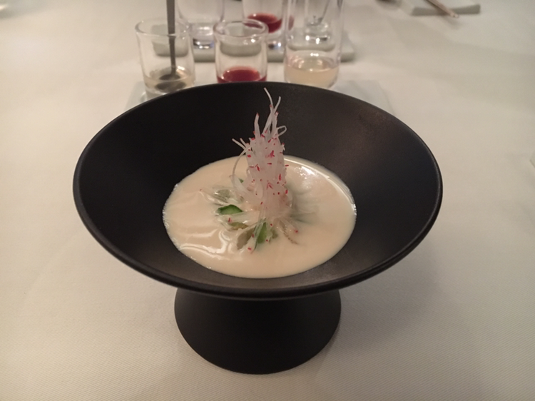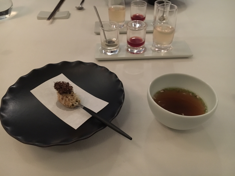 트러플이 올려진 두부 샌드와 오골계 맑은 국 : 트러플 향미가 조금 더 있었으면 좋겠다고 생각. 오골계 맑은 국은 정말 맛있었다. 세가지 식초는 마시거나 음식에 가미할 수 있다.