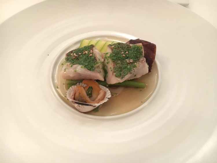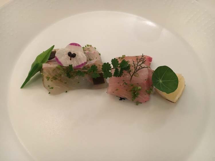 겨울 울릉도 취나물과 깻잎 순을 곁들인 생선, 완도 광어, 제주 방어 : 왠지 일식스러운 플레이팅. 광어는 심부에서 올라오는 듯한 쫄깃거림이 있었는데 그게 정말 좋았다.