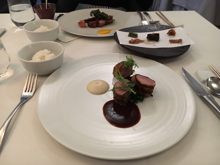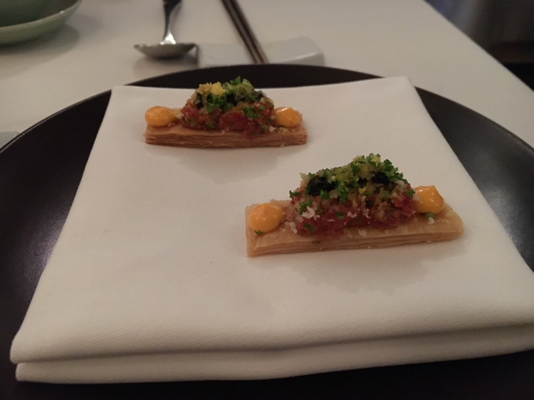 한우 육회와 고추장 소스, 곤드레 나물 장아찌 : 한우와 고추장 소스가 참 잘 어울렸다. 페이스트리는 오히려 쫄깃한 한우에 비해 겉도는 식감이라 조금 방해가 되는 것 같았다.