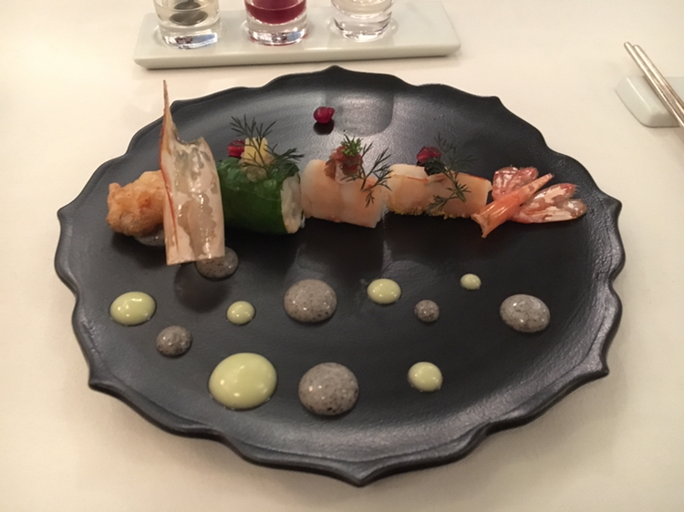 4가지 스타일의 자연산 대하 : 알록달록 오밀조밀한 플레이팅. 정갈하게 공들인 느낌이 났고, 세가지 모두 다른 맛이 나서 재미있었다. 대하는 내 기준에 조금 뻑뻑하게 느껴졌다.
