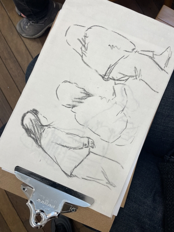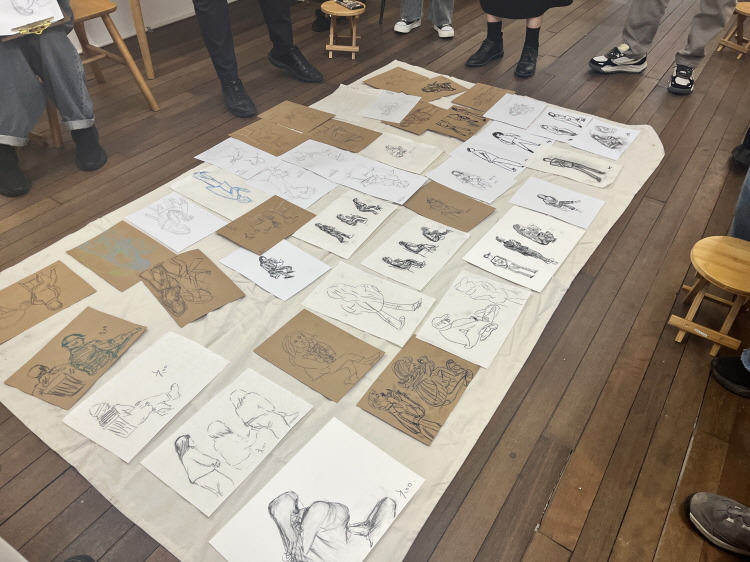 길게는 10분, 그리고 3분, 1분 30초, 30초 동안 모델로 포즈를 취한 선생님의 특징을 빠르게 관찰하며 망설임 없이 첫 크로키를 진행했습니다. 처음 그려보는 크로키에 첫 그림에는 망설인 흔적이 고스란히 드러나는 자잘한 선들이 보였지만 시간이 지날수록 다들 대범하게 선을 쓰면서 모델의 특징을 그려주셨어요.