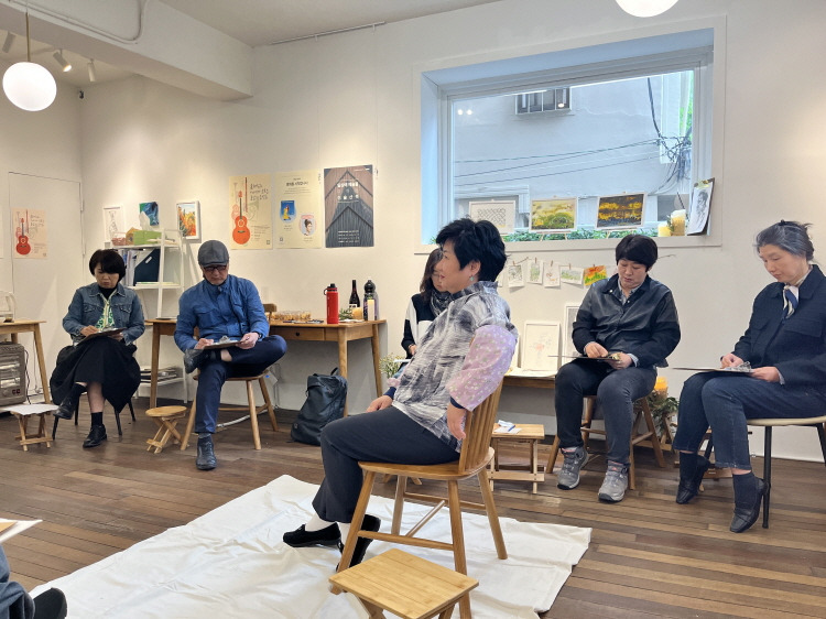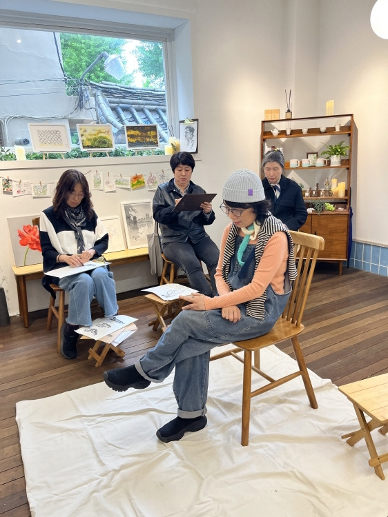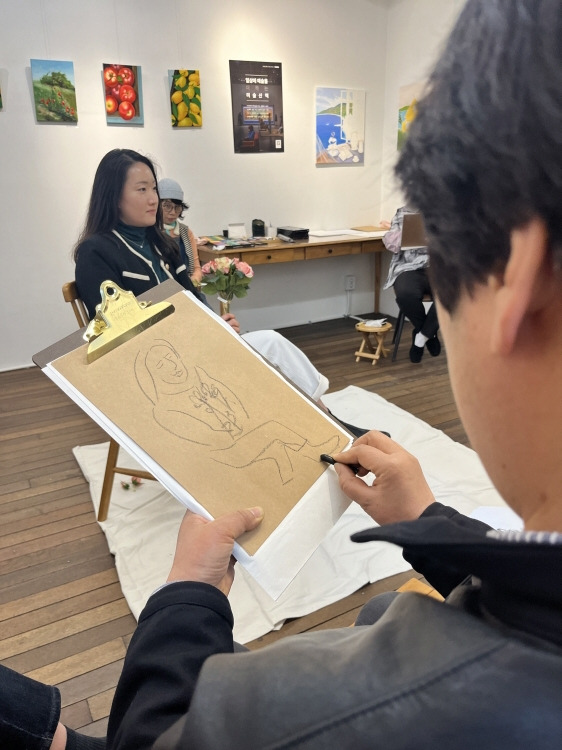 멤버마다 듣는 미술 수업은 다르지만, 이날만큼은 같은 취미를 즐기는 사람들과의 교류로 편안하고 즐거운 분위기가 계속됐어요. 각자 포즈를 고민해 보고 직접 모델로 서보는 재밌는 시간도 가졌습니다. 크로키가 끝나고 난 후에는 각자의 개성이 담긴 그림에 대한 생각을 나누고, 오뉴가 준비한 다과를 즐기는 시간이 이어졌어요.