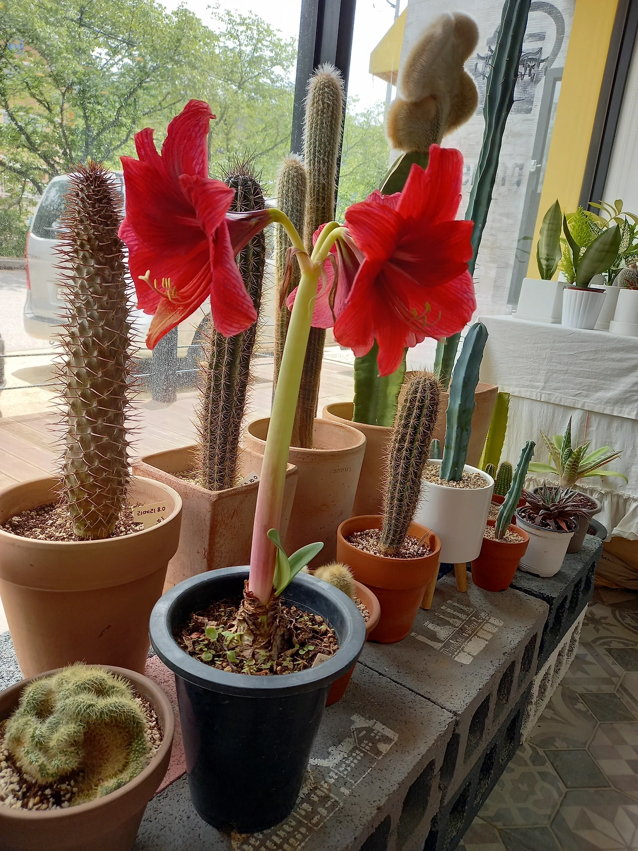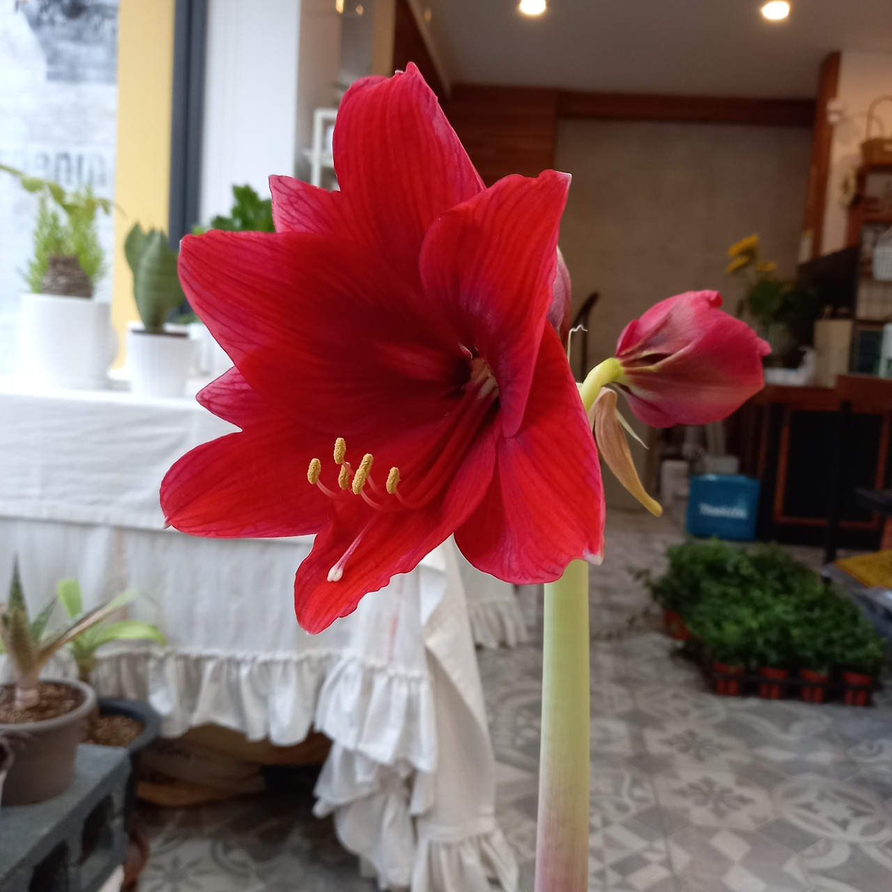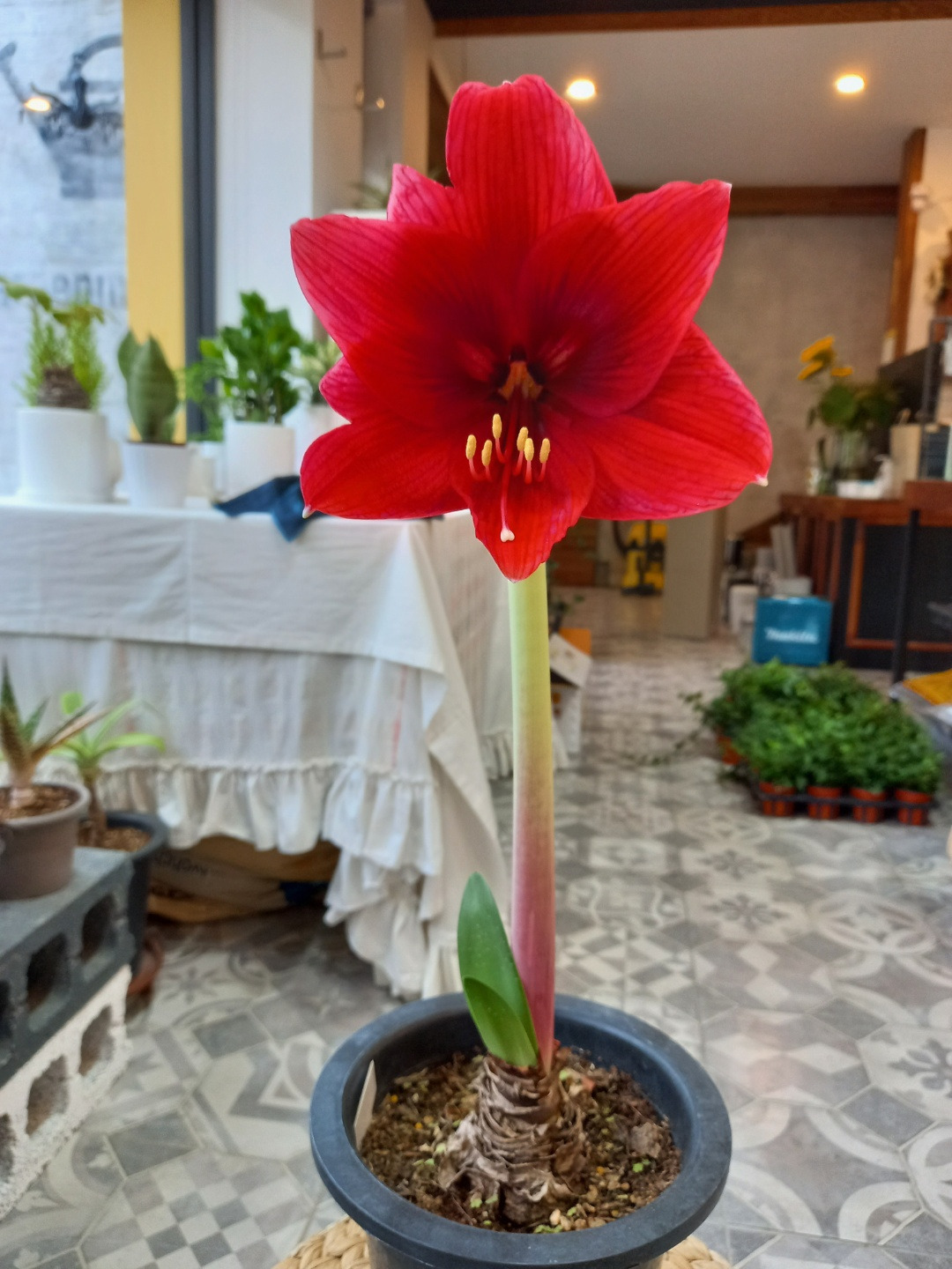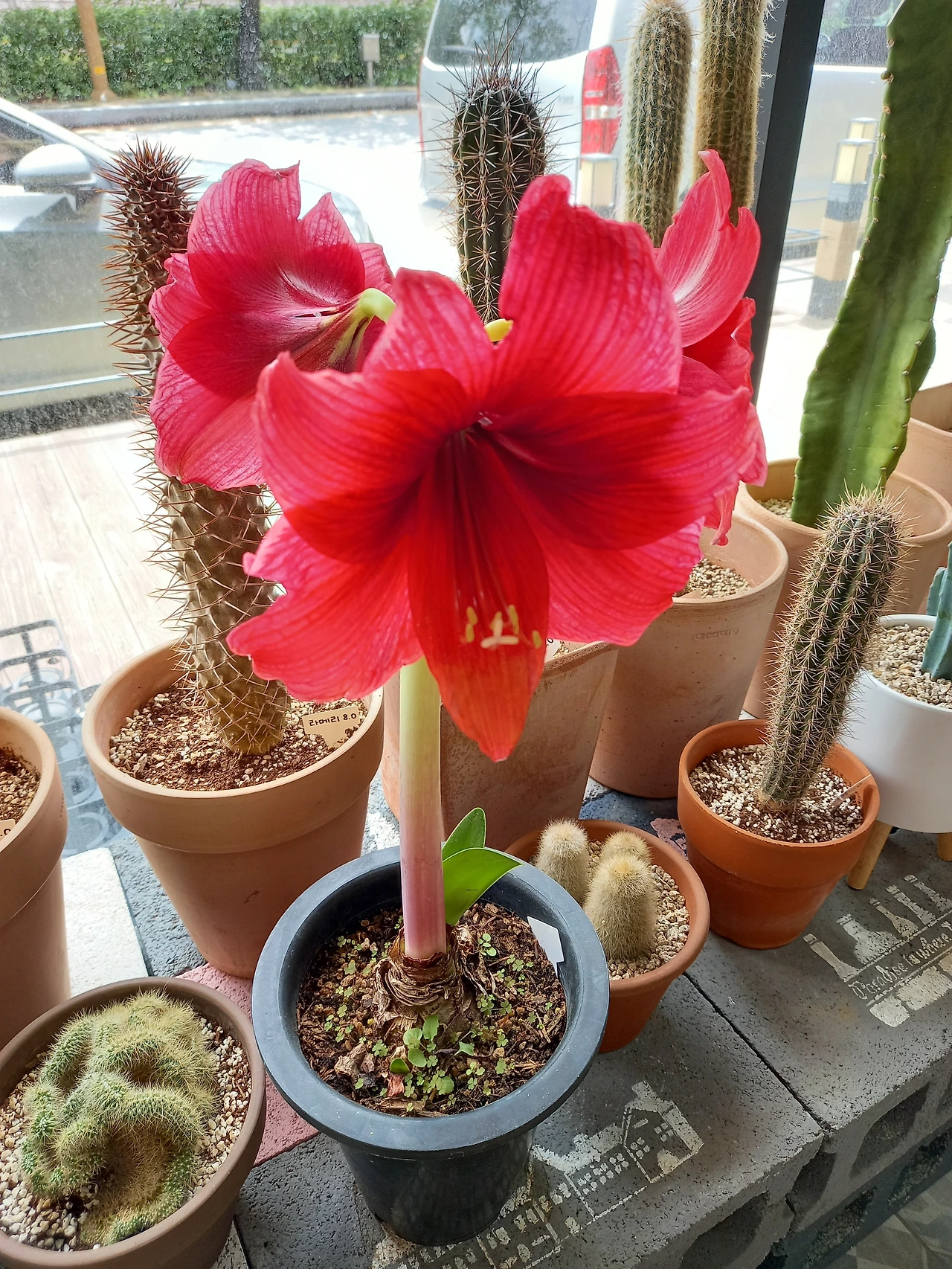 아마릴리스는 멕시코, 남미 지역이 원산지로 꽃이 매우 크고 화려하다. 활짝 개화했을 때 아이 얼굴만 한 크기다. 아마릴리스의 대표 컬러는 레드인데, 요즘엔 다른 색상도 많이 보이고 무늬종도 있는 것 같다. 특히, 겹꽃의 화려함은 어마어마하다. 꽃이 크고 화려한 덕분에 절화용으로도 많이 판매된다.
