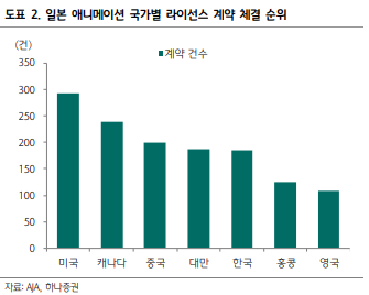 아래 일본 애니메이션의 매출 비중을 보면, 2015년 이후 해외 비중이 급격하게 커지는 걸 볼 수 있습니다. (넷플릭스의 진출 시점과도 일치하네요) 21년 기준으로는 내수 시장과 거의 차이가 나지 않죠. 미국, 캐나다, 중국, 대만, 한국 순으로 라이선스 계약이 활발한 것을 볼 수 있습니다.