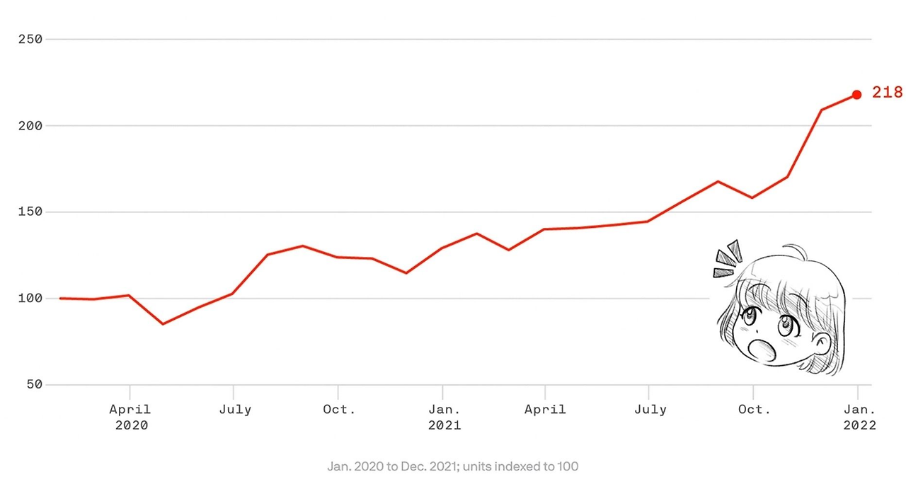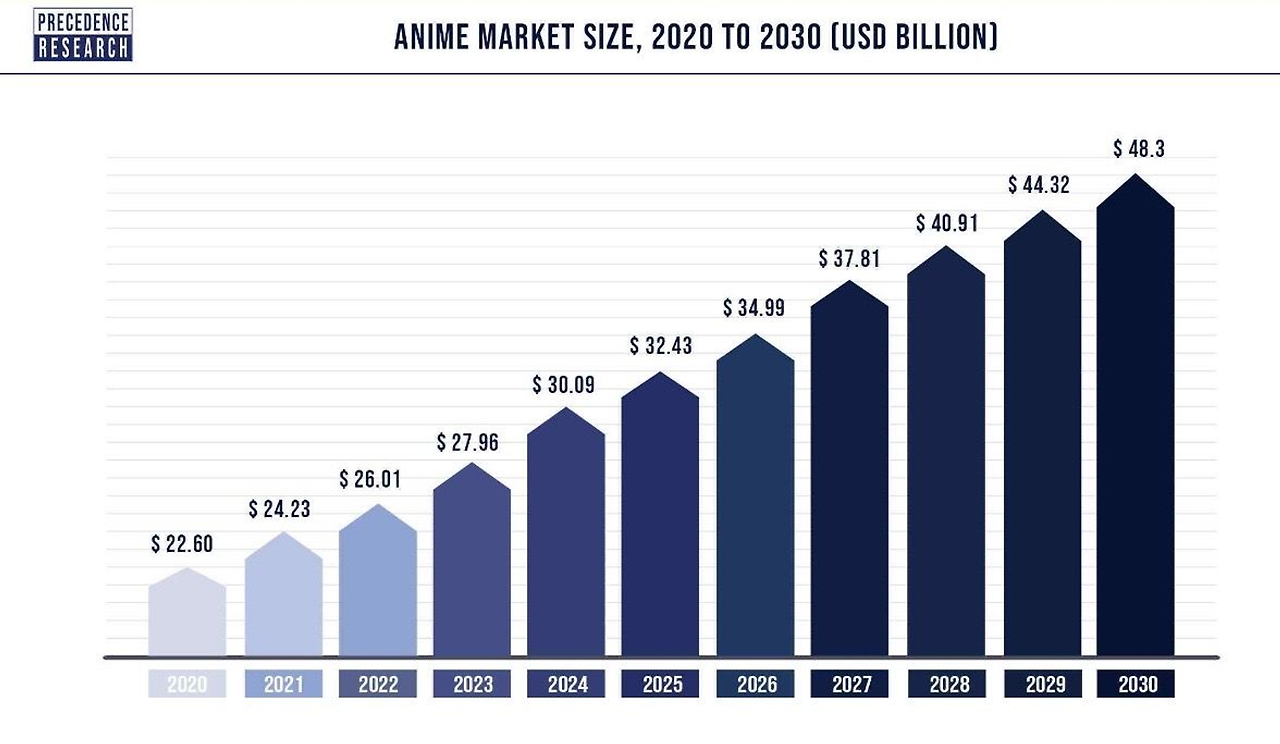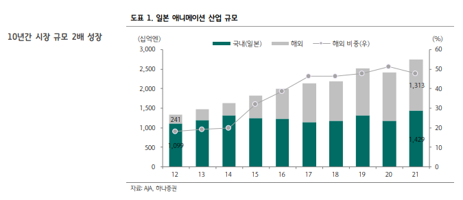 그러나 애니메이션 하면 떠오르는 나라는 일본이죠. 일본의 경우는 180억 달러 규모의 시장으로, 아시아 애니메이션 시장의 40% 이상, 전 세계의 10% 이상을 차지하고 있습니다. 21년 기준으로는 2조 7422억 달러에 달합니다. 팬데믹기간 2배 이상 성장을 하기도 했죠. (아래)