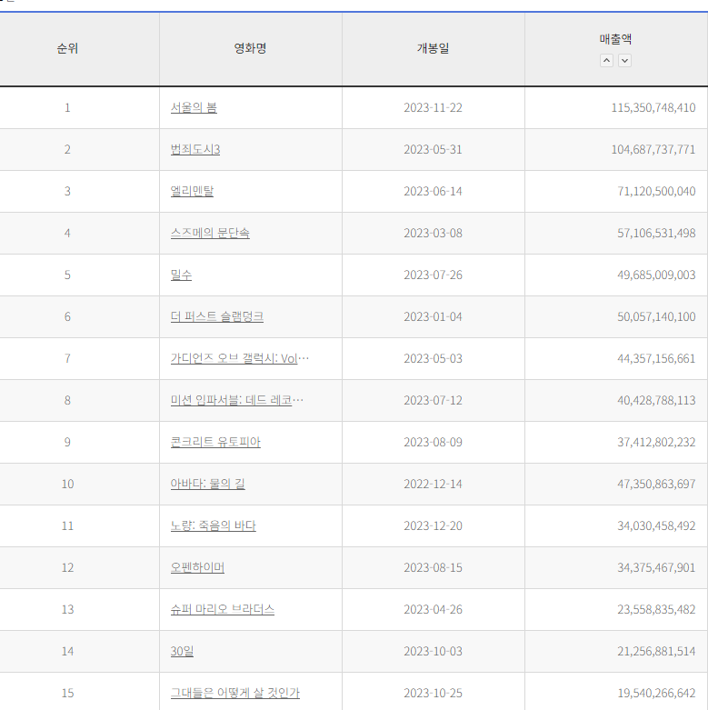 <엘리멘탈>(720만), <스즈메의 문단속>(557만), <슈퍼 마리오 브라더스>(239만), <그대들은 어떻게 살 것인가>(200만)까지 한국 박스오피스 TOP 15 중 5개가 애니메이션이었습니다. 디즈니 1편, 유니버설 1편, 3편은 일본 애니메이션이었죠.