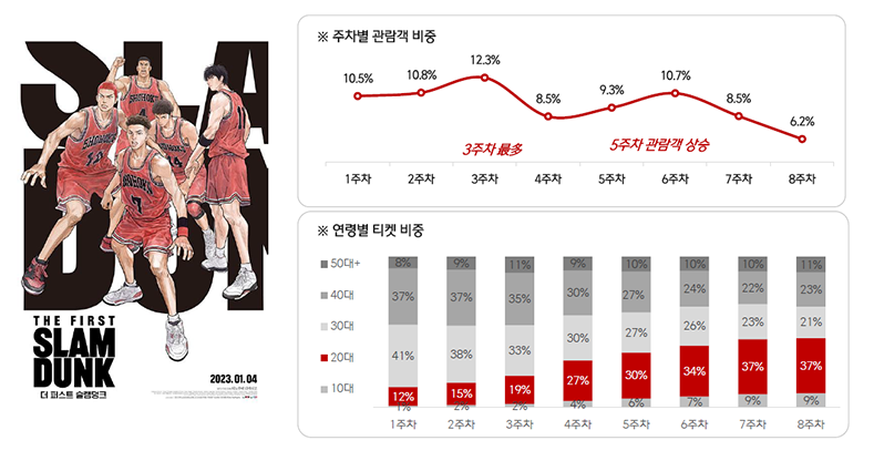 <더 퍼스트 슬램덩크>는 최근 1-2년 사이 트렌드가 되었던 ‘낭만’의 대명사로 많은 사랑을 받았었죠. 이 영화의 흥행에는 20대 여성들이 있었습니다. 개봉 초기에는 <슬램덩크> 시리즈를 향유했던 30~40대 남성들이 관람을 이끌었으나, 2030대 여성 관객들이 점차 주도하게 되었는데요. 과거 <슬램덩크> 시리즈를 보고 자란 세대가 아닌 새로운 층이 유입이 된 것이죠.