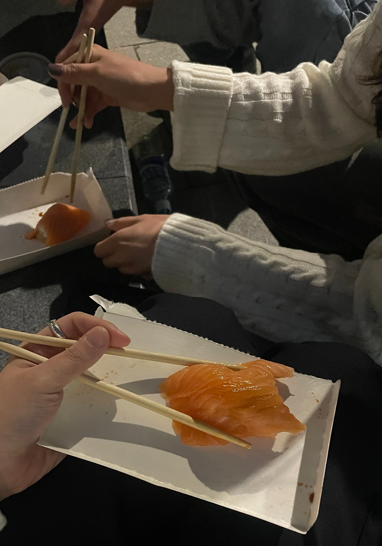 결국 우리가 발견한 곳은 어느 빌딩 앞 휴식터였다. 휴식터였는지는 사실 자신할 수 없다. 그냥 깨끗하고 앉기 좋은 대리석들이 배치되어 있는 곳이었으니까..... 우린 그곳에서 아직 3월의 꽃샘추위에 기승인 바람과 사투를 벌이며 연어초밥을 먹었다. 그런데 세상에 이렇게 맛있는 연어초밥이라니.