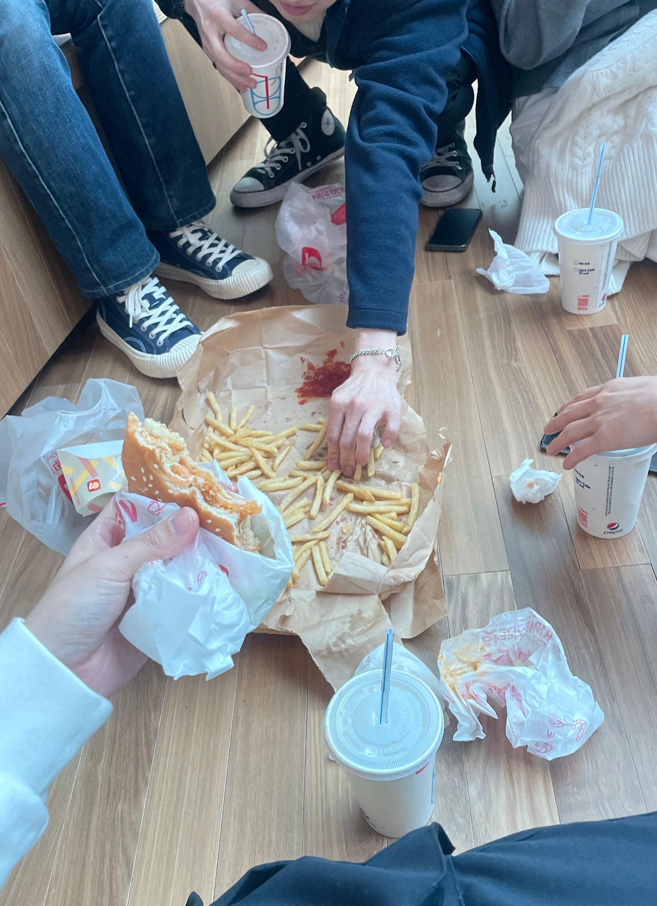 출발 전으로 돌아와 우리는 공항 구석 바닥에 앉아 급하게 끼니를 해결해야 했고, 그래서 감자튀김을 먹기 편하게 깔아서 다 같이 먹자는 의견이 나와 그렇게 먹고 있었다.
