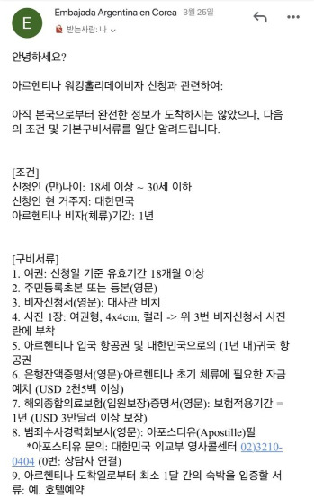 2018.12.03 한-아르헨티나 워킹홀리데이가 스페인어권에서는 세 번째로 협정 체결이 되었고, 2019.01.25 드디어 협정 발효되었다. 이때였다. 퇴사를 마음먹은 것은. 그리고 바로 아무런 계획도 없이 사장님께 퇴사를 질렀다. 이러한 나의 추진력내 주변 동료, 선후배들은 무척이나 놀랐고, 엄마와 오래된 친구들은 역시나 하는 반응을 보였다. 그리고 바로 주한 아르헨티나 대사관에 이메일로 비자 발급 문의를 하였다.