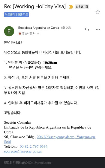 보통 출국일 기준으로 2개월 전부터 비자 서류 준비 및 접수가 가능하다. 먼저 서류를 스캔하여, 대사관 이메일로 보내면, 대사관 직원이 답메일로 나의 연락처를 알려달라고 한다. 그리고 알려준 연락처로 전화를 하여, 인터뷰 날짜를 잡아준다. 아르헨티나 입국일이 9월 15일이므로, 8월 23일에 인터뷰가 잡혔다. 모든 서류는 원본으로 준비해오며, 비자신청서는 51. 서명란을 제외하고 다 작성하라고 한다.