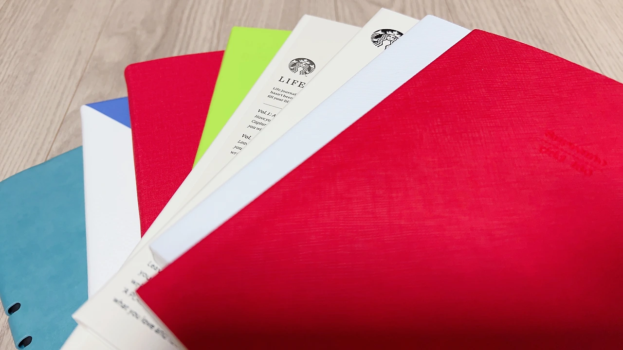 맨 아래 녹색+파란색의 노트는 쿠팡에서 구입한 A5노트이다. 겉표지가 좋아서 구입했으나 내지가 좀 저렴한 느낌이긴 한데, 아무거나 막 기록하기에 좋아서 한 달 한 달 마감 노트로 사용할까 한다.