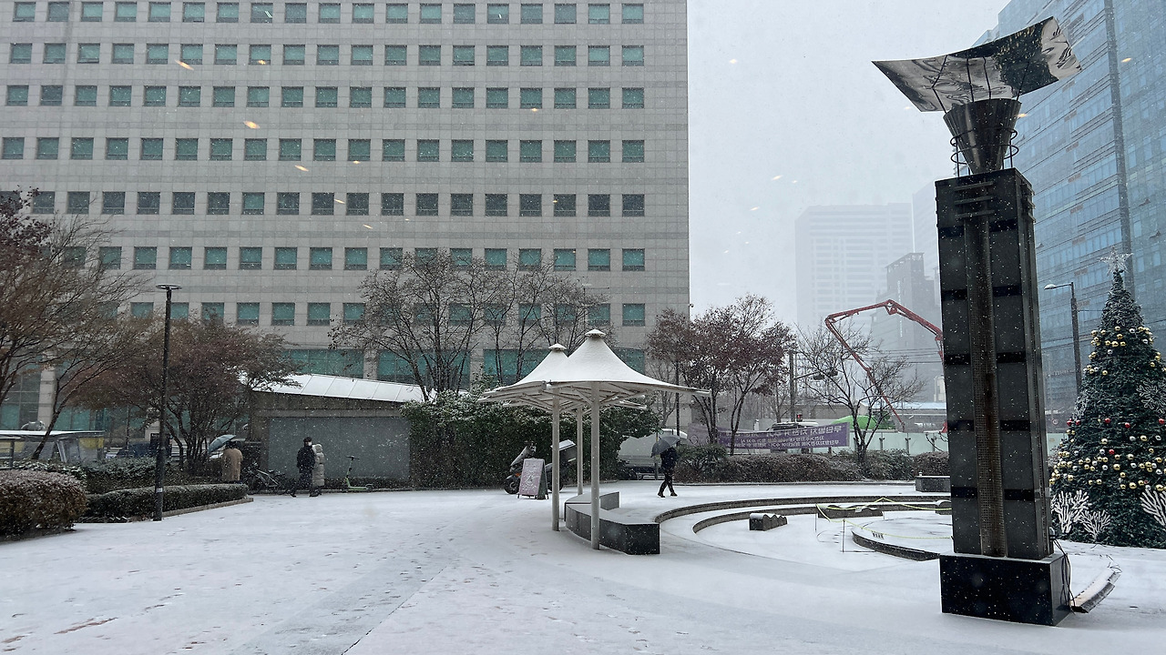 그런데 눈이 펑펑 내리던 날, 예약 환자들도 캔슬 되고 바깥을 바라보는데 “와”하는 감탄사가 절로 나왔다. 눈이 쌓여가는 석촌호수의 매직아일랜드를 바라보는 데 꿈같은 세상이 펼쳐졌다.