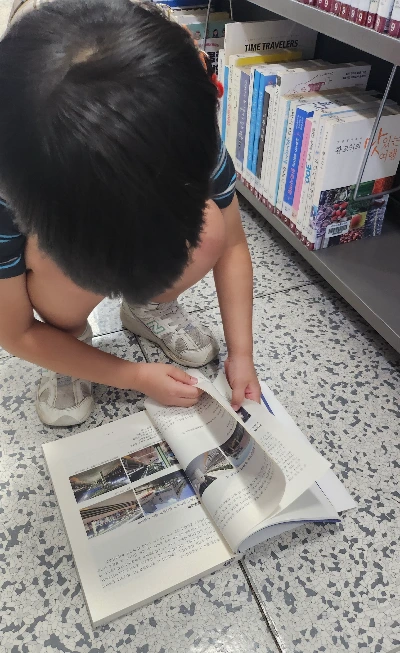 아이가 도서관에서 보고 있는 책들은 기차 전문 서적이다.