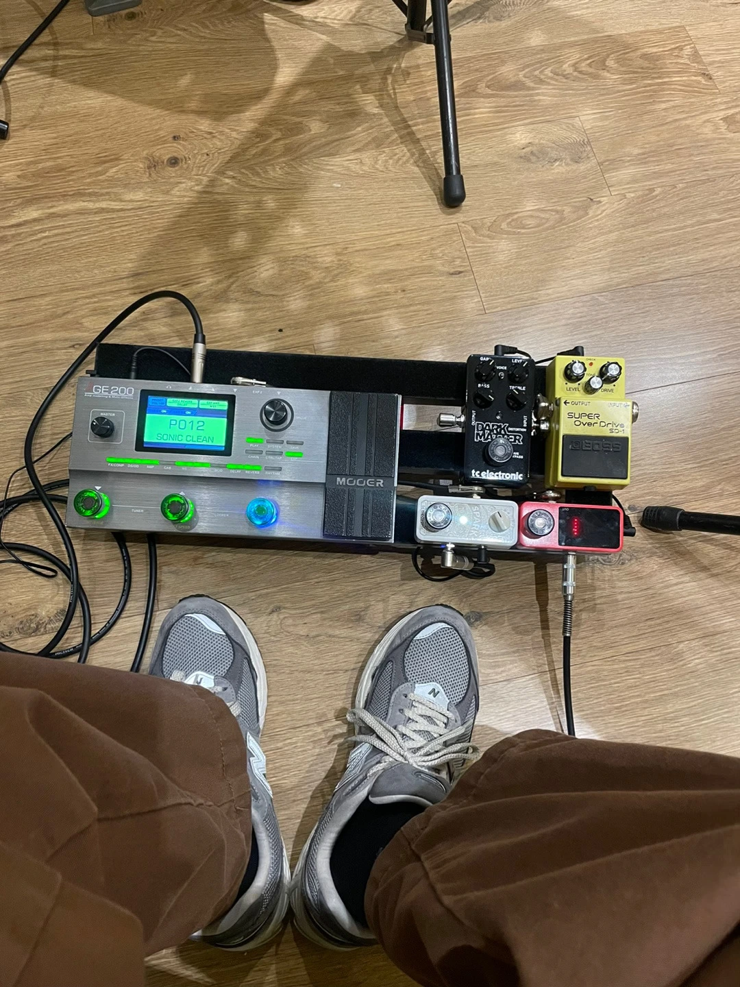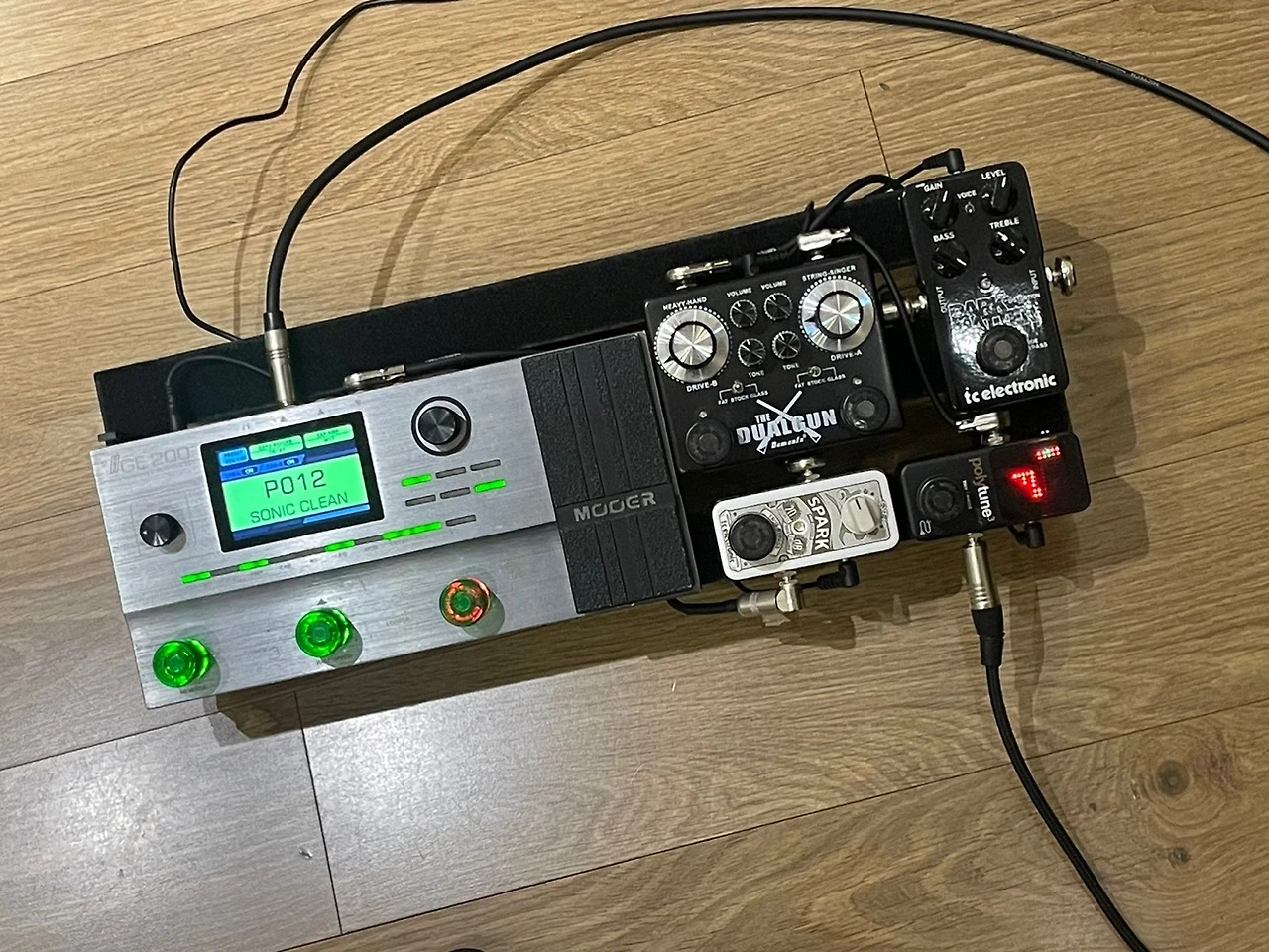 기타 -> 폴리튠 3(튜너) -> demonfx dual gun(드라이브) -> dark matter distortion(디스토션) -> spark mini(부스터) -> ge200(앰프&캡 시뮬, 모듈레이션, 공간계 담당) -> 앰프 return