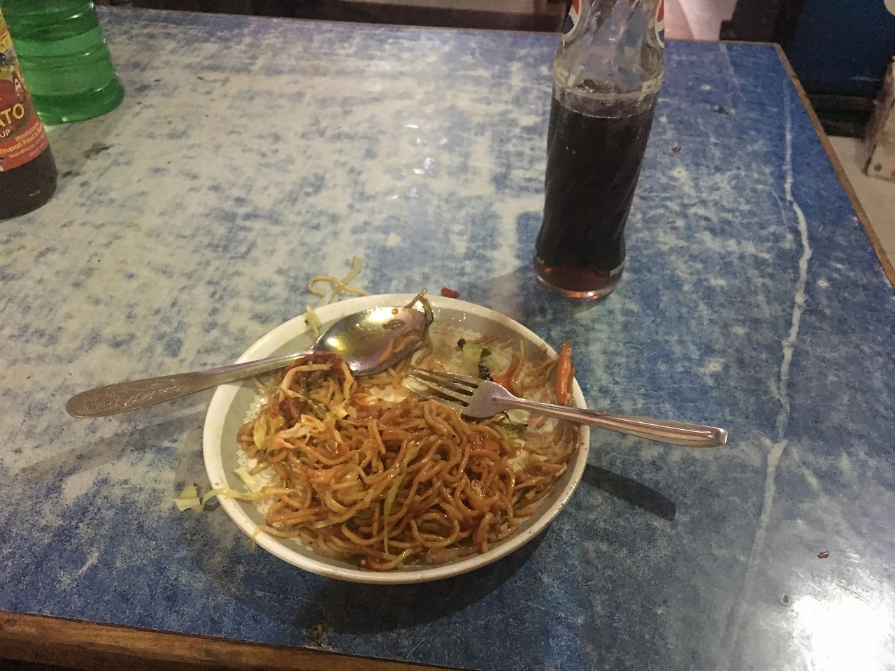 가이드가 배가 고프다고 볶음국수를 먹자고 해서 그에 단골 식당으로 간다. 건물과 건물 사이에 좁은 틈에 지붕은 얻은 식당은 매우 어둡고 불결해 보인다. 볶음국수 하나를 시켰는데 50루피란다. 그런데 두 접시가 나와서 물었더니 볶음국수 하나를 시키고 두 접시에 담아 달라고 하면 양을 넉넉히 해줘 싸게 먹을 수 있다며 웃는다. 인심이 좋은 식당이다.