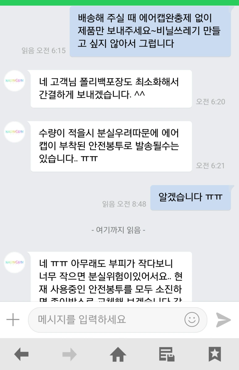 늘 요청한 대로 되는 건 아니고 번거롭지만, "쓰레기 만들기 싫다" 는 피드백을 줘야 판매자 입장에서도 포장을 바꿀 이유가 생긴다고 본다.