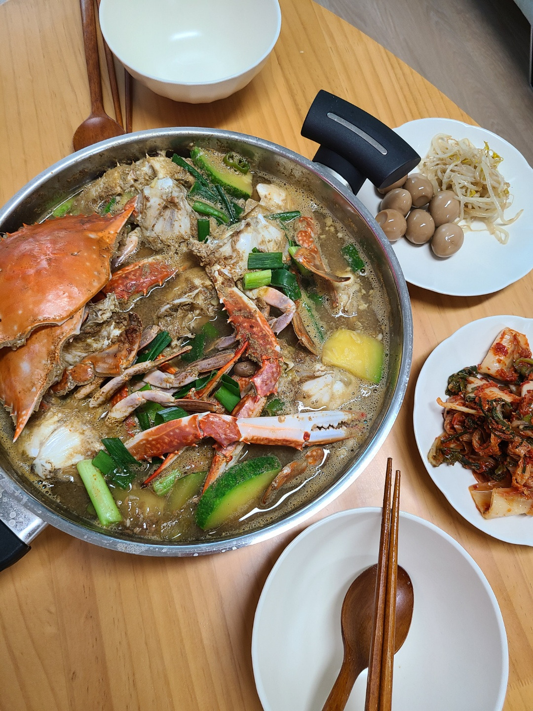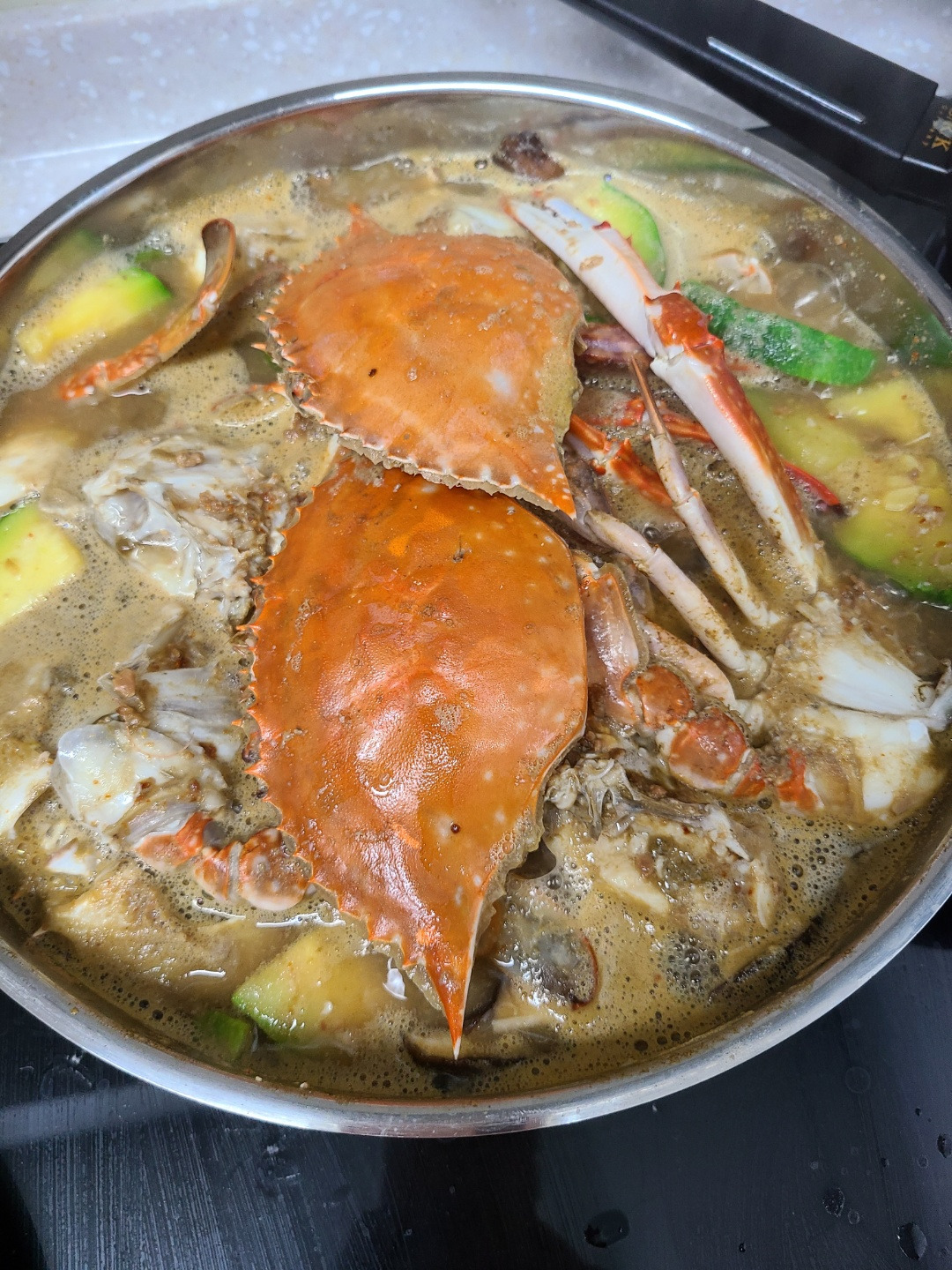 나는 어릴 때 먹은 스타일로 된장을 많이 풀고, 감자랑 호박을 넣어서 끓였다. 게내장이 국물에 다 풀리면 그것도 한번 먹고 버리기는 조금 아까워진다. 게 손질하는 법은 검색 고고.