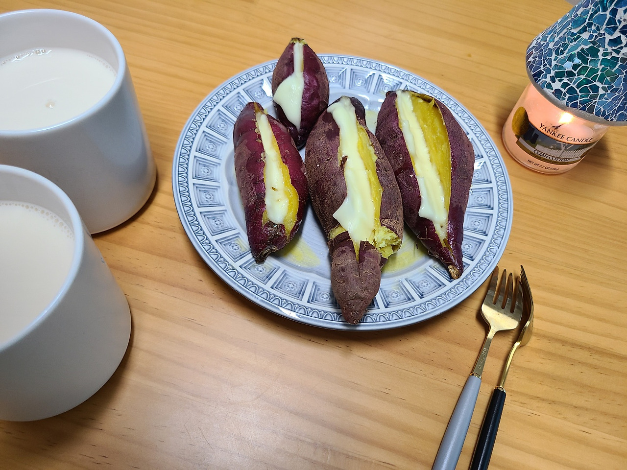 이러고 점저 사이에 간식으로 고구마를 에프에 구워서 먹었다. 구워진 고구마를 반으로 썰고 안에 버터랑 치즈를 넣어서 다시한번 돌려주면 더 달짝지근하고 고소한 고구마 간식 탄생.