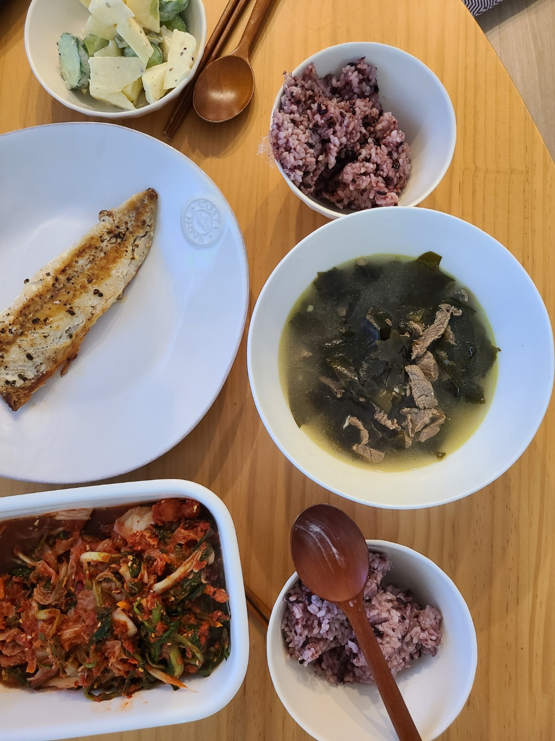 저녁으로는 해동한 고등어 한 마리를 굽고, 사과랑 오이를 마요네즈에 버무린 사라다, 소고기 미역국 마지막.