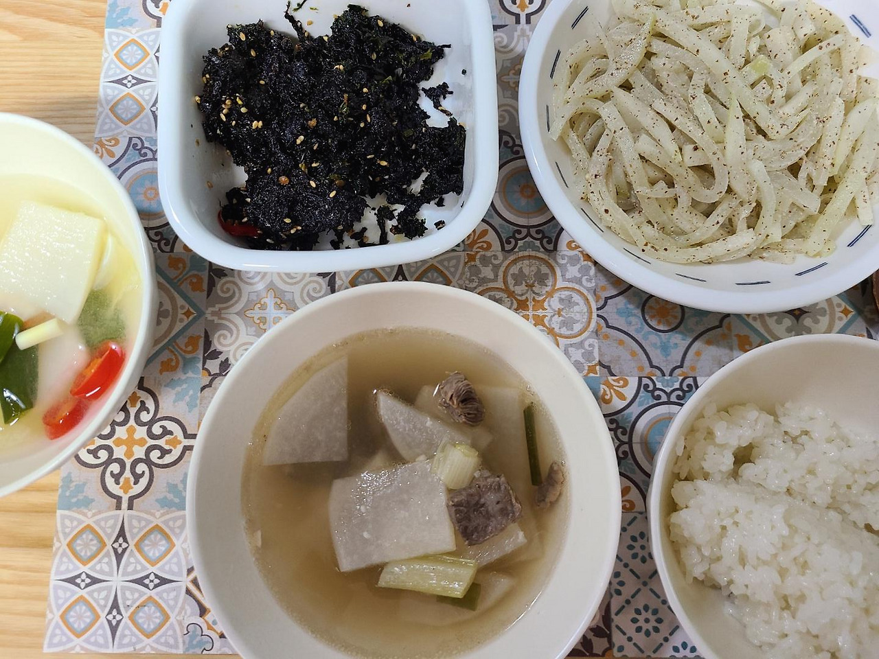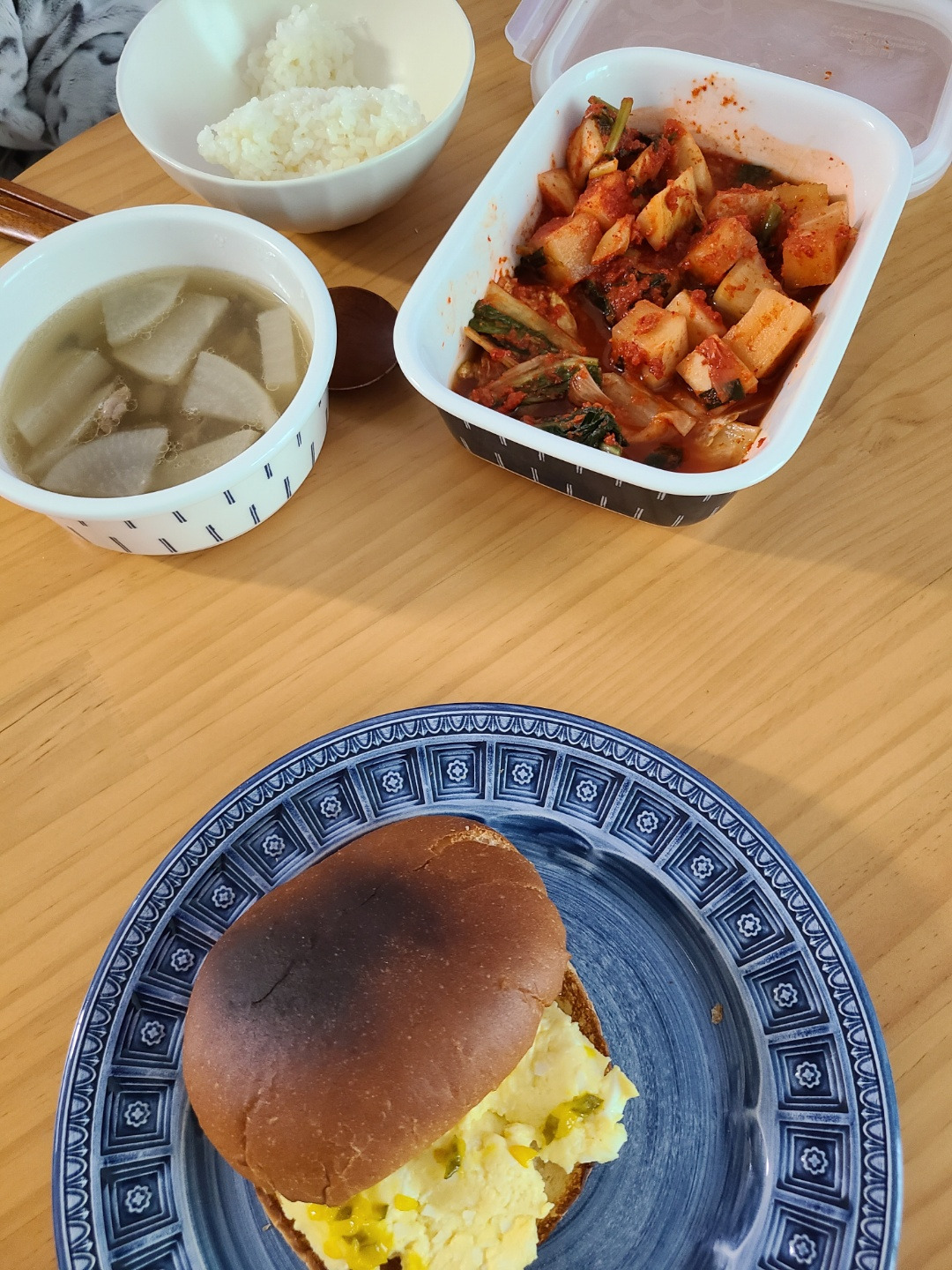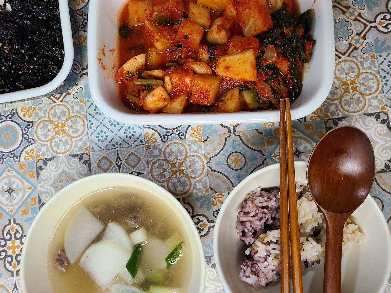 재택해서 점심 혼자 먹은 사진인 줄 알았다가, 이 주에는 J가 바빠서 저녁을 몇 번 혼자 먹었었구나, 하고 기억해 냈다. 소고기무국을 한솥 끓여서 깍두기랑 저녁으로 먹었다.
