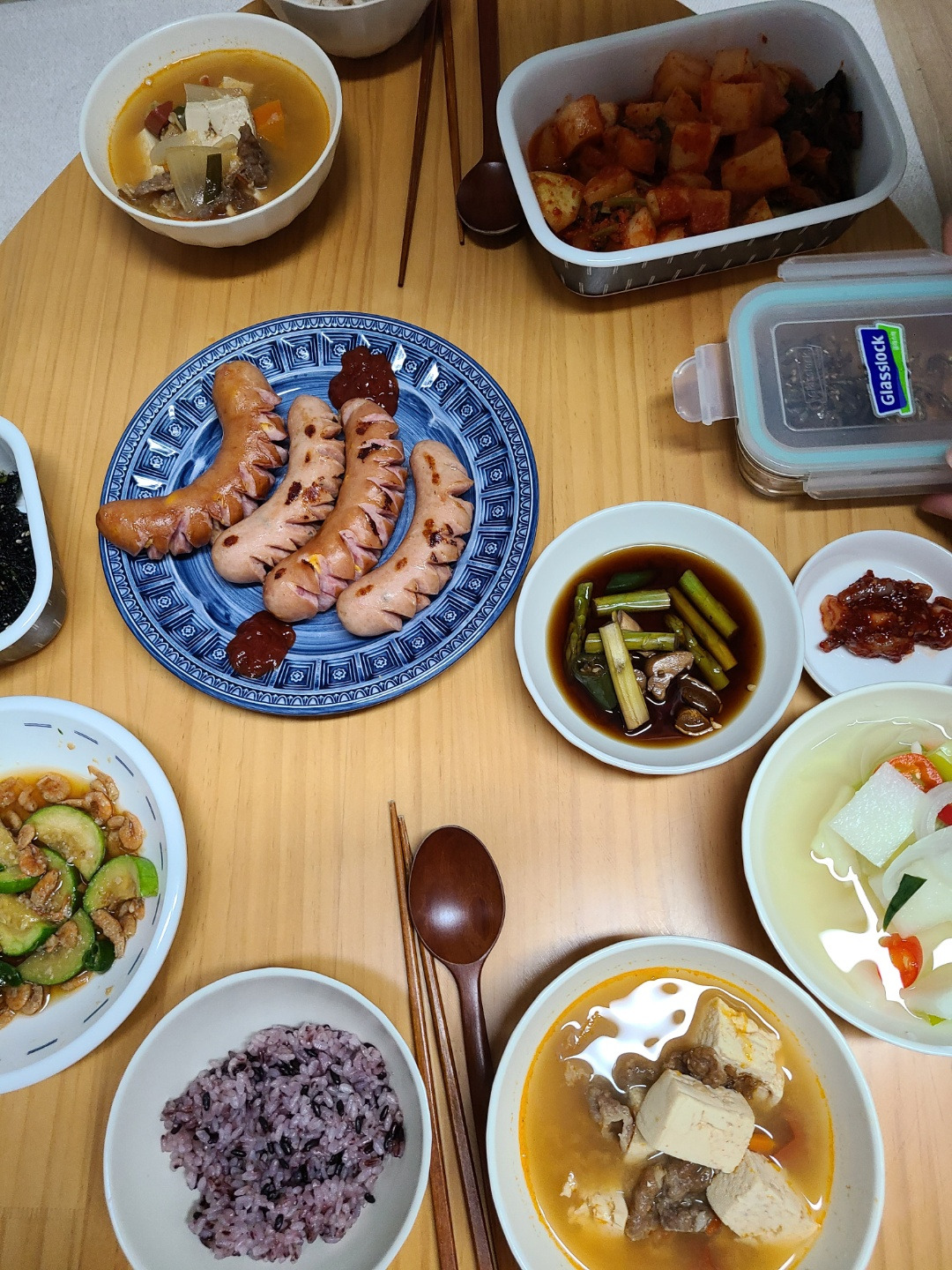 있는 반찬 다 꺼내고 소세지 구워서 저녁.