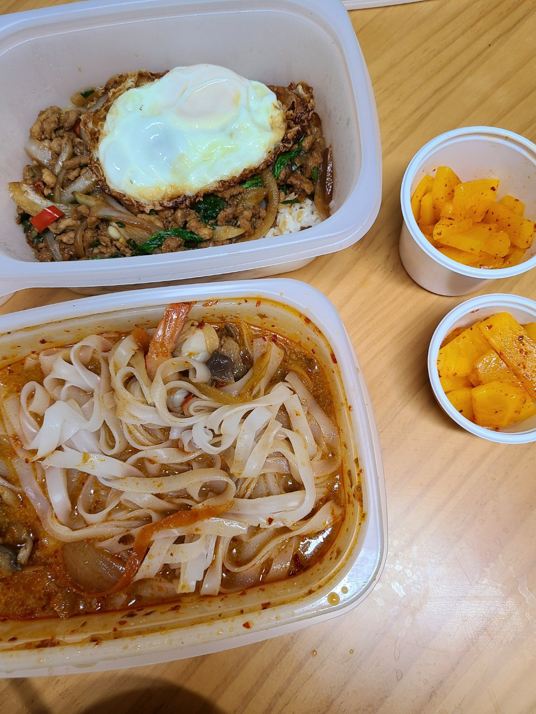 저녁에는 벌써 세 번째 주문하는 동네 타이음식점에서 돼지고기볶음밥이랑, 똠얌꿍쌀국수 주문.