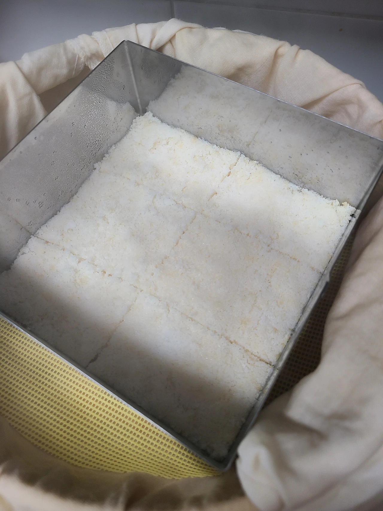 5) 찜기에 면포를 깔고 가루를 고르게 펴 넣어준다.