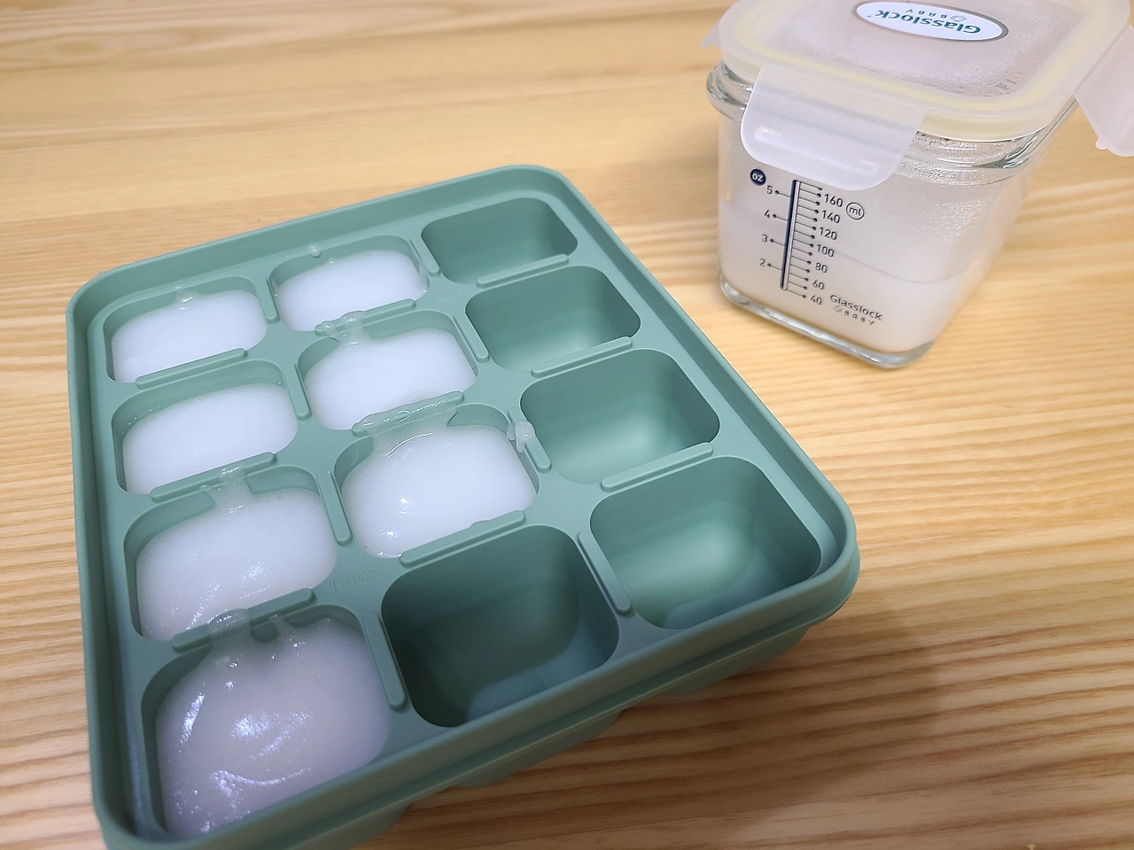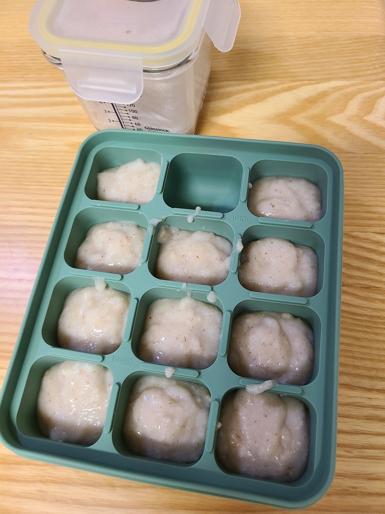 결과물은 쌀죽 300g, 30g씩 실리콘 큐브에 담는다.