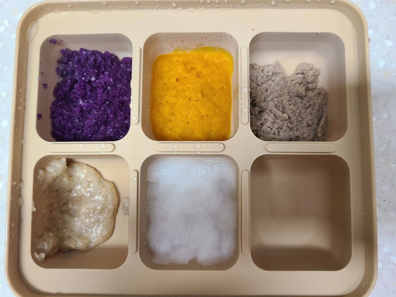 예쁜 식판도 있지만 준비가 안되어... 세척해 둔 60ml 큐브틀에다 먹였다. 이 방법은 재료들이 안 섞여서 좋지만 적채 같이 수분감 적게 흩어지는 토핑은 아기가 받아먹는 것보다 흘러나오는 게 더 많았고, 식사 시간도 더 오래 걸렸다. 그리고 큐브틀에 먹이려면 물에 중탕하는 방법이 조금 어려울 것 같아 전자렌지를 썼다.