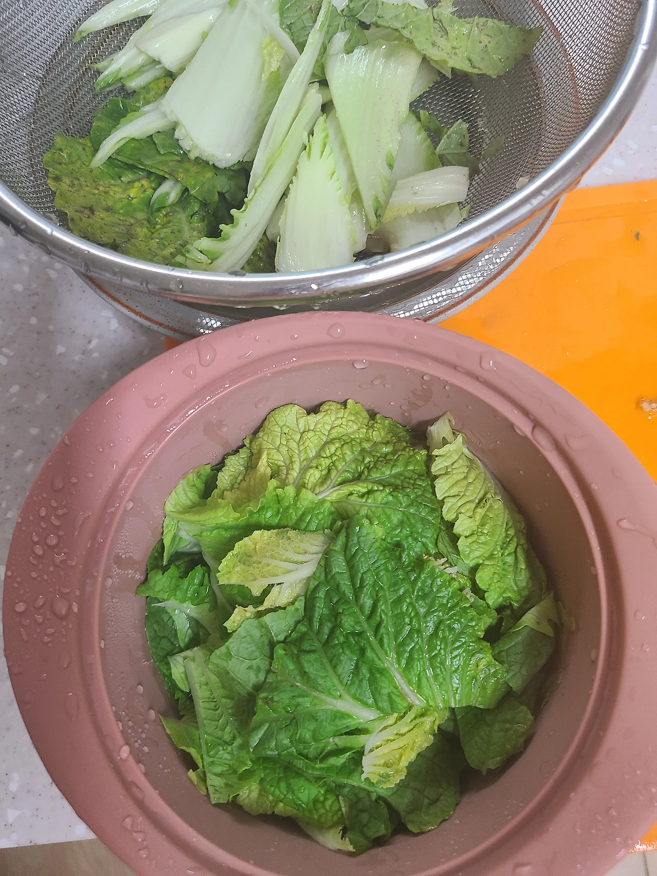 1) 흐르는 물에 이파리 하나씩 뜯어서 씻고, 질긴 줄기 부분을 칼로 도려내며 한 장씩 다듬는다.