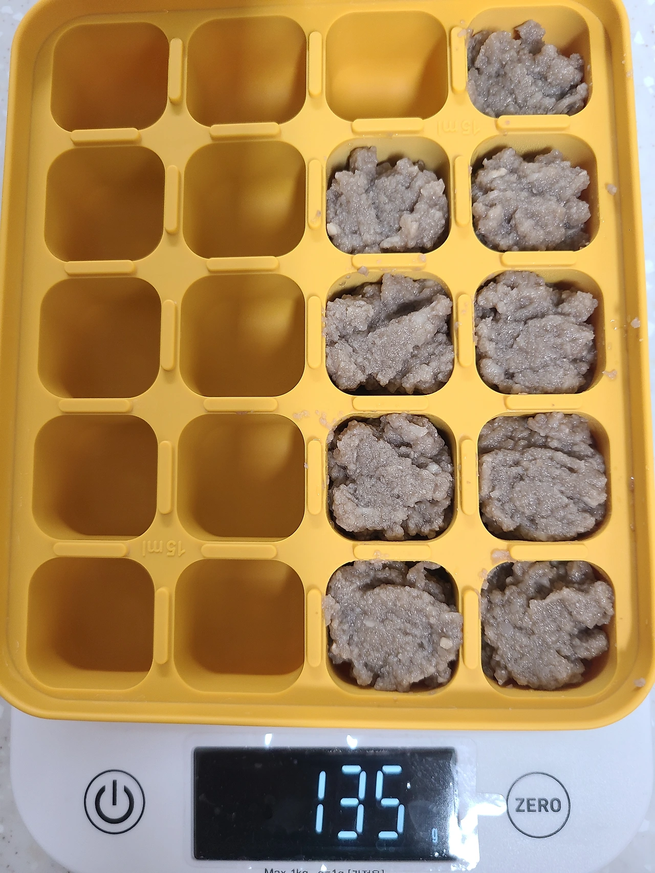 5) 5분 정도 중불에 볶았다. 물기가 날아가고 풍미가 좋아진다. 15g씩 소분하여 9개 큐브 완성!