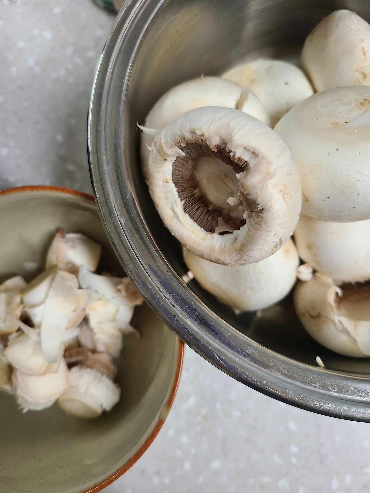 1) 한 팩에 4~5개 든 것이 2천원대, 총 10개의 양송이로 조리했다. 버섯은 굳이 깨끗이 씻지 않아도 되고 적당히 흐르는 물에 씻는다.
